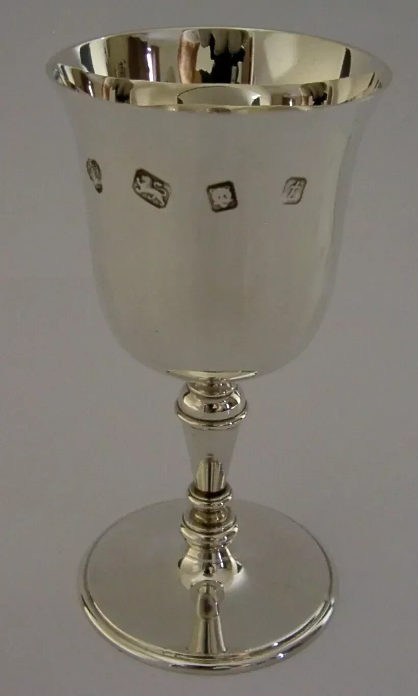 A super quality English solid sterling silver goblet. It is hallmarked for London 1974 with the makers mark being that of C J Vander Ltd. It has been superbly designed and holds 60ml. It is in super condition being free from dings splits distortions and repairs. It measures approx. 4.25 inches (10.2cm) tall by 2.25 inches (5.6cm) across the rim by over 2 inches (5.4cm) across the base and weighs 100 grams. A very good quality piece.