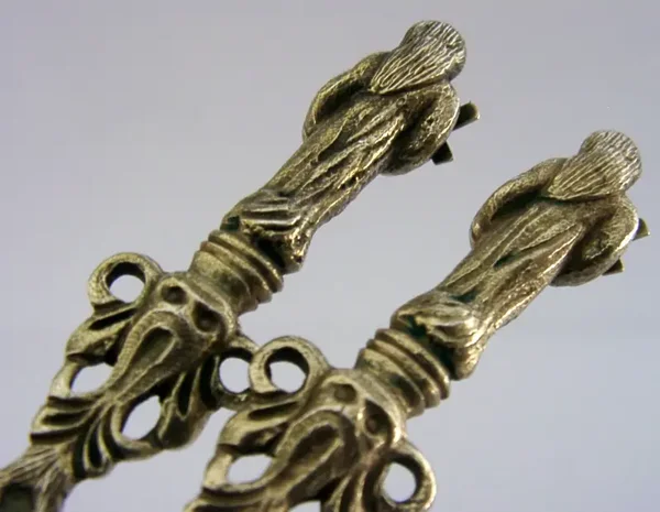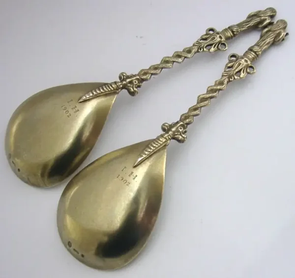 A superb pair of Danish solid silver gilt serving spoons. They are both hallmarked with the Danish three towers silver mark and the date code 90 for 1890. They have been beautifully designed being decorated having cast handle with the terminals being in the form of Mary carrying a cross and bible. The back of the bowls have been engraved IH 1902. They are in superb condition being free from dings splits and repairs. They measures 7.25 inches (18.2cm) long by over 2 inches (5.2cm) wide and weigh 112 grams. A beautifully designed useable set.