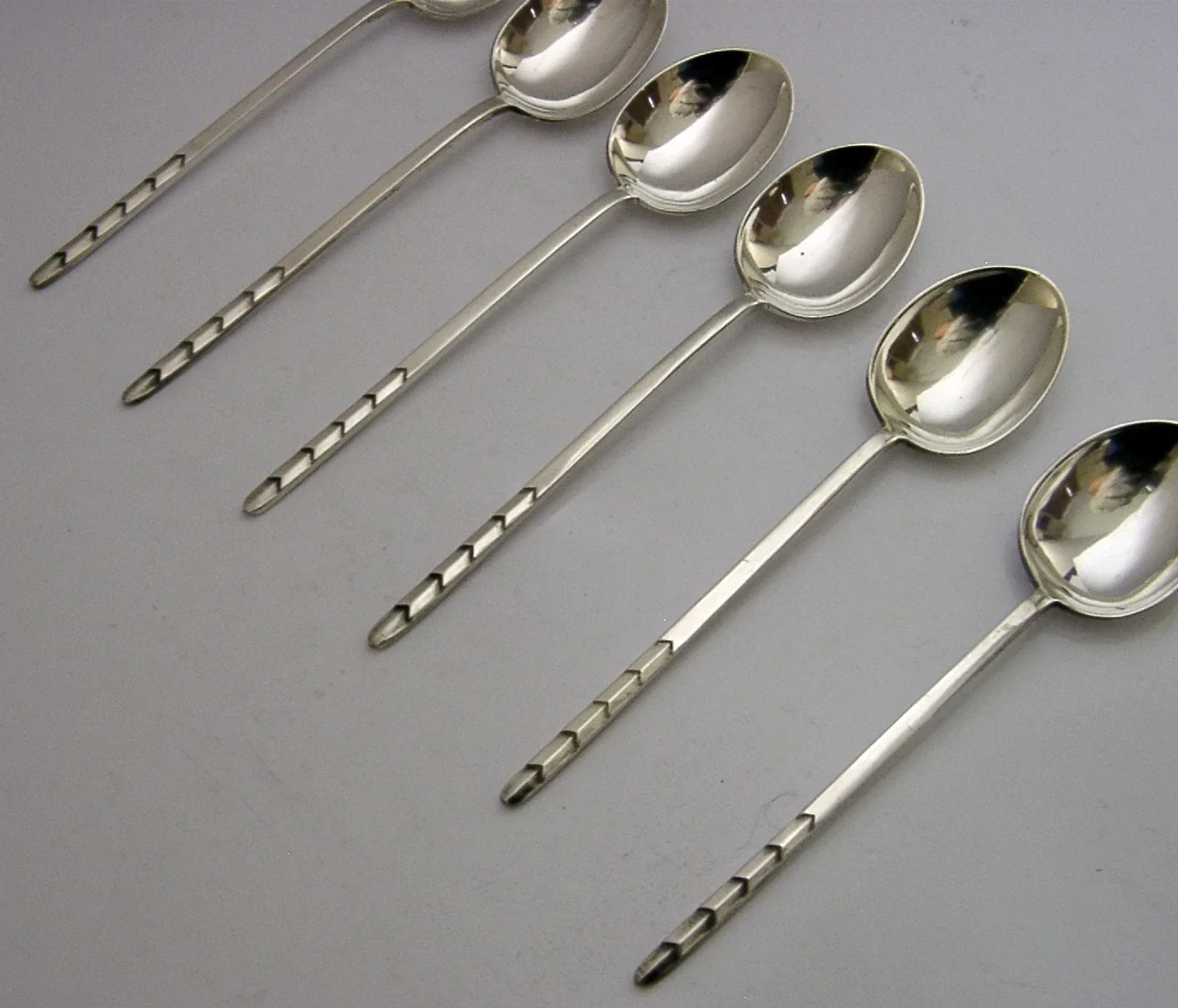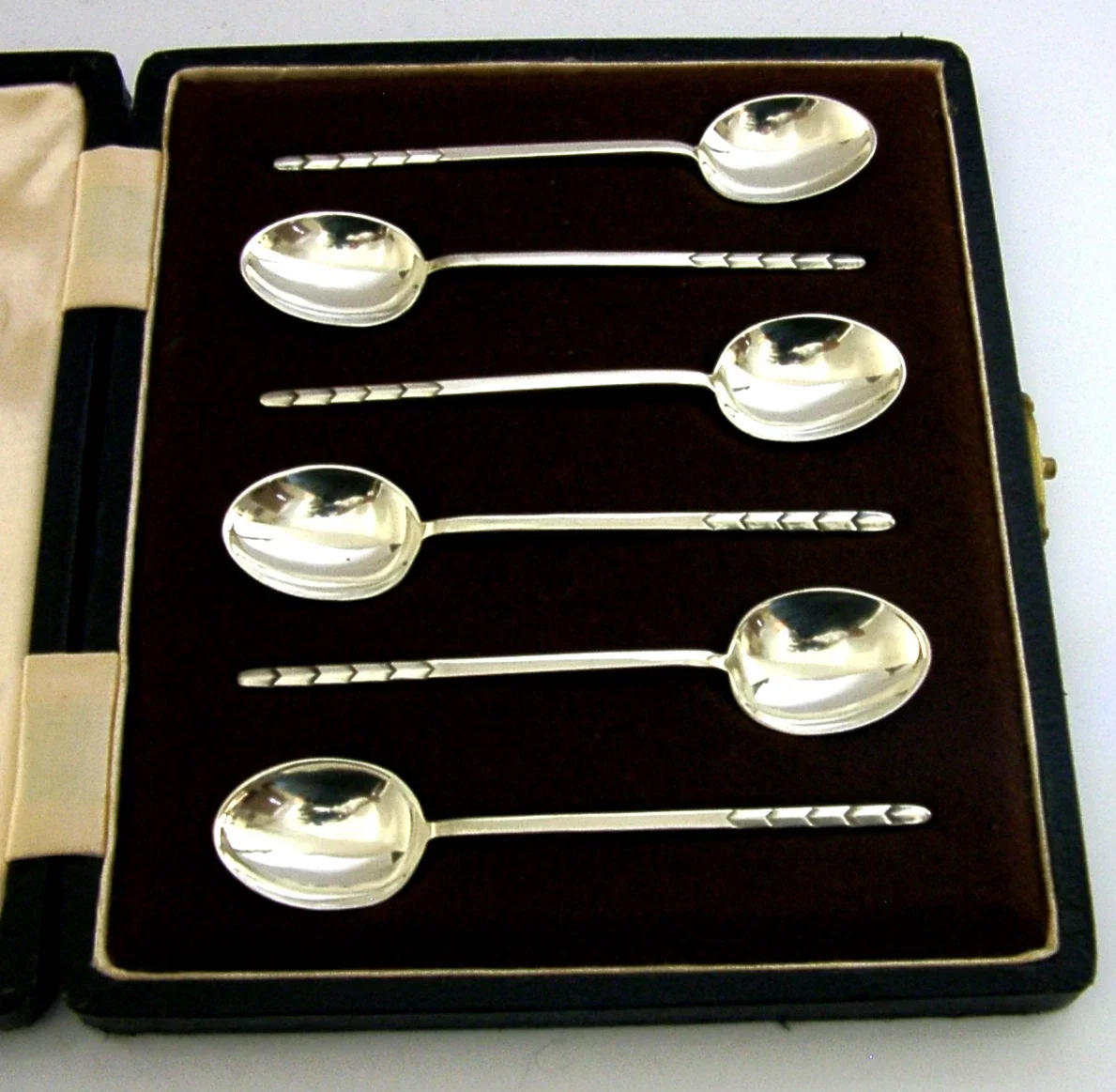 A beautiful stylish set of six cased solid sterling silver Art Deco spoons. They are hallmarked for Sheffield 1944 with the maker being Walker & Hall. They have been stylishly designed and are in super condition being free from dings splits and repairs. They measure approx. 3.5 inches (9cm) long by 0.75 inch (1.9cm) wide and have a combined weight of 36 grams excluding the case. A beautifully designed set.