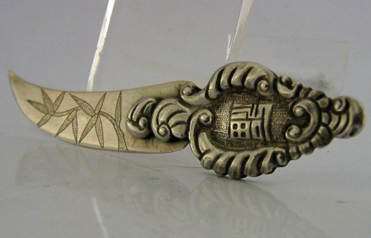 A rare Chinese solid silver bookmark or page maker. It is hallmarked with the makers mark and tests as high grade silver. I would date it to c1920. It has been beautifully designed with the terminal depicting a Chinese character and engraved with bamboo leaves. It is in superb condition being free from dings splits and repairs. It measures approx. 3 inches (7.6cm) long by over 0.5 inch (1.7cm) wide and weighs 4 grams. A nicely designed example.
