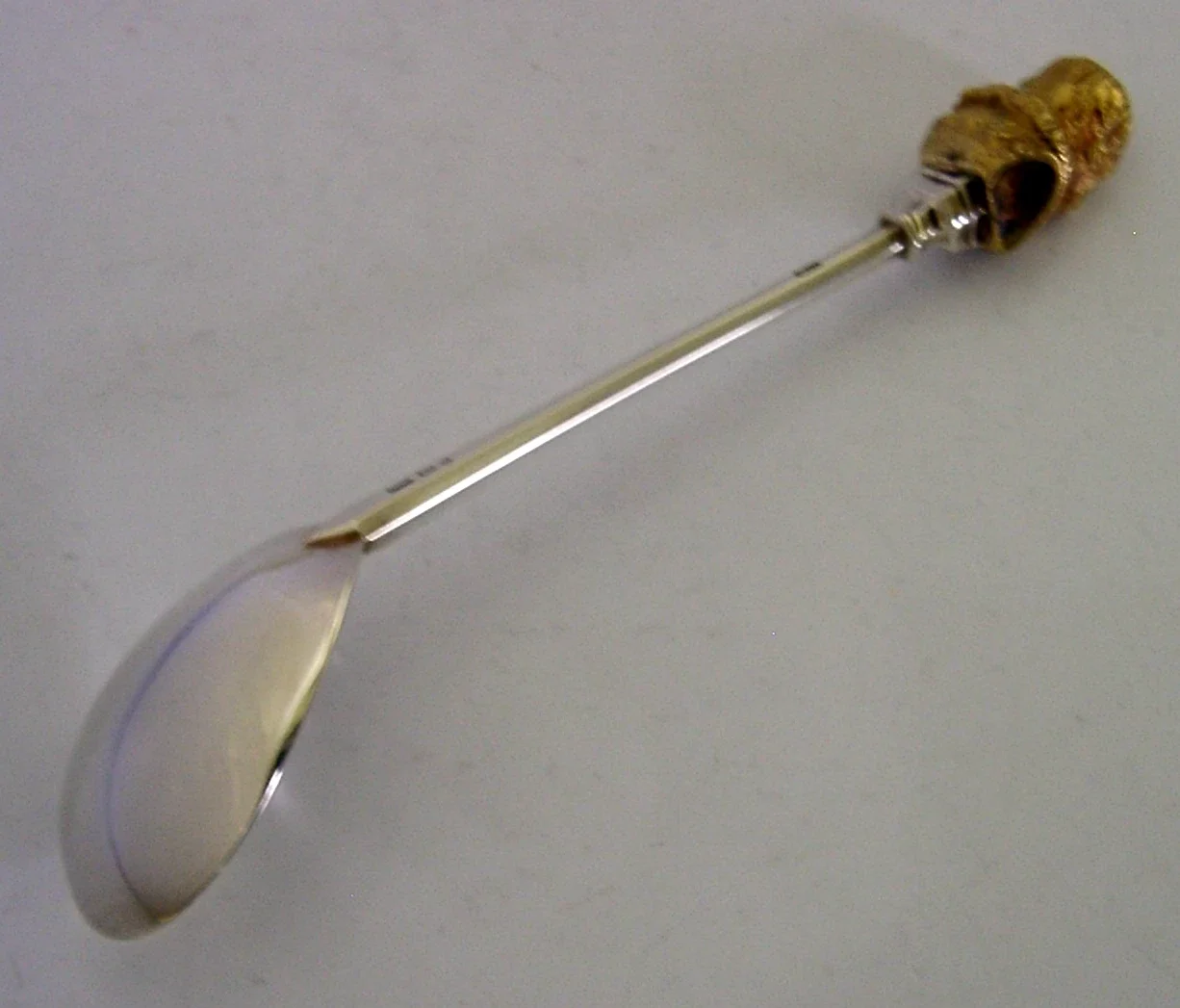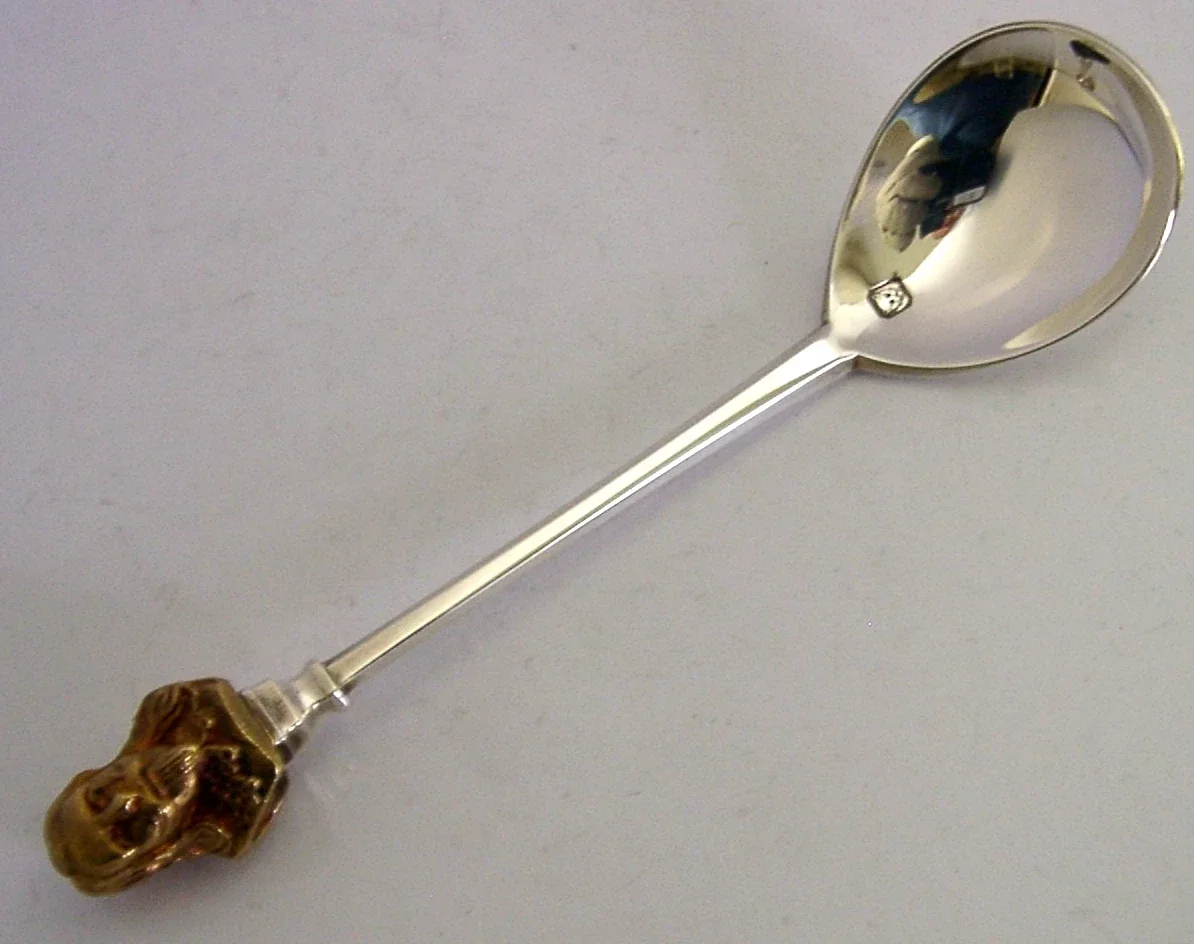 A super quality heavy cast solid sterling silver spoon. It is hallmarked for London 1975 with the makers marks being LIH. It has been superbly made being cast and gilded in the form of Queen Mary II. It is in superb condition being free from dings splits distortions and repairs. It measures approx. 4.5 inches (11.5cm) long and weighs 33 grams. A superb quality piece.
