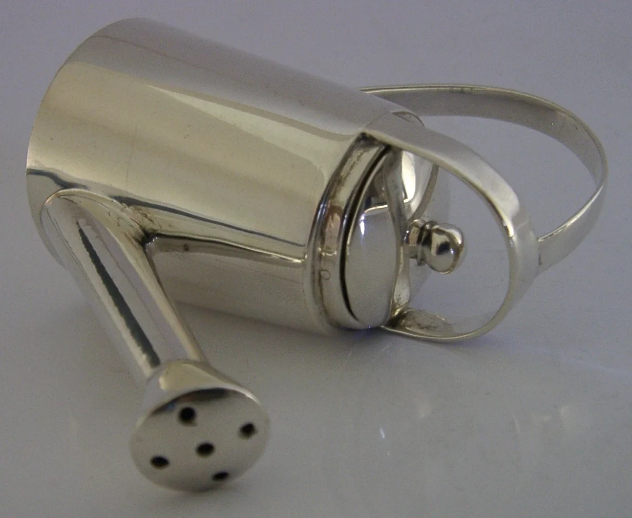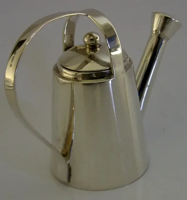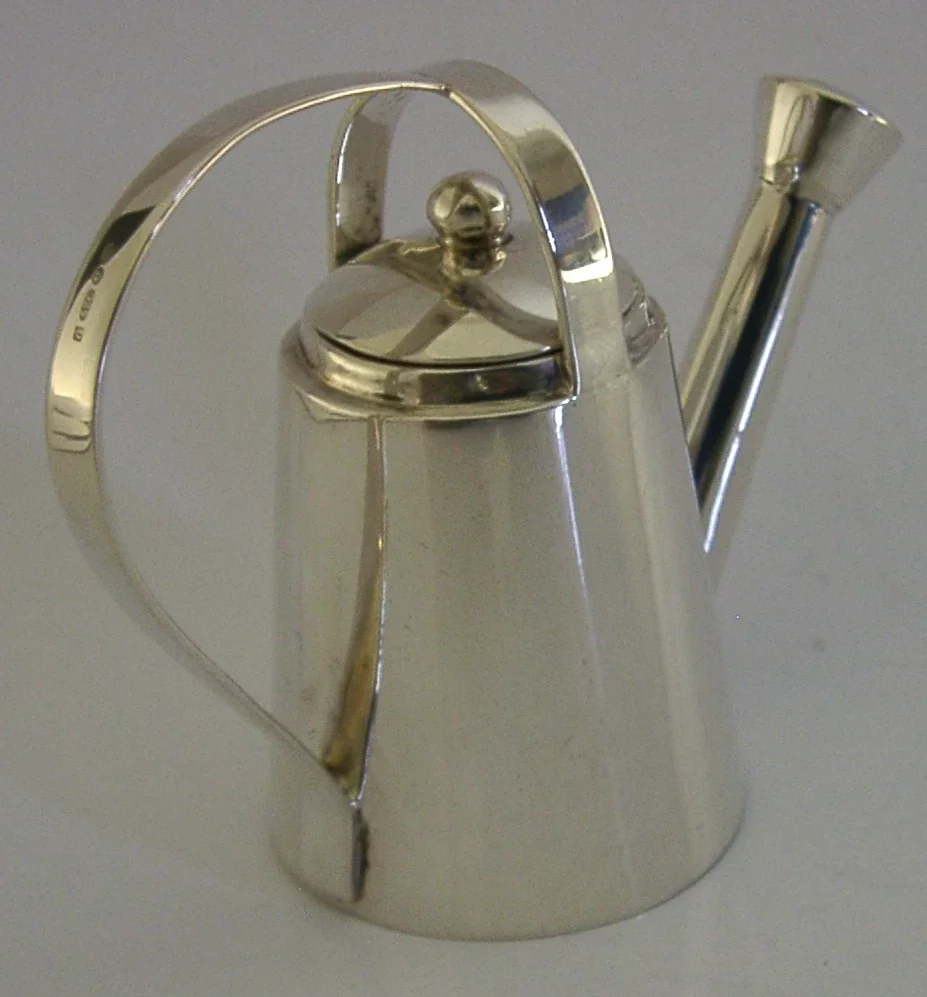 A super quality English imported solid sterling silver pepper pot. It is hallmarked with import marks for London 1995 with the importer being Links of London. It has been superbly designed being in the form of a watering can. It is in superb condition being free from dings splits and repairs. The inside is clean and the lid fits nice and tight. It measures approx. 3.25 inches (8.2cm) across spout to handle by 1.5 inches (3.6cm) wide by over 2.5 inches (6.6cm) tall and weighs 54 grams. A beautifully made clean example.