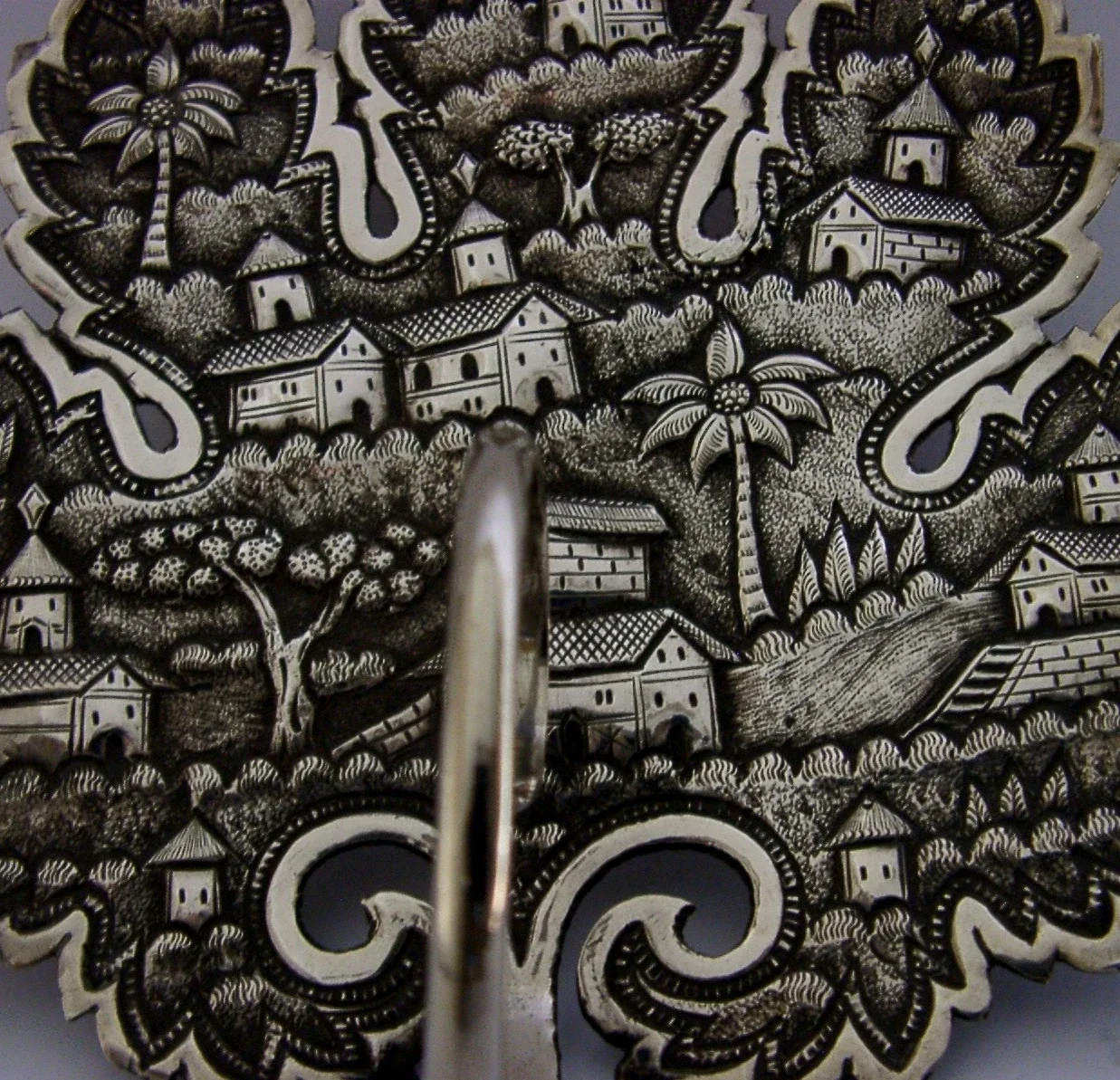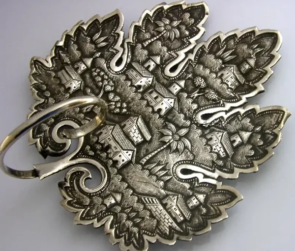 A superbly detailed Anglo Indian antique solid silver dish. It is unmarked but tests as high grade silver. It has been superbly made being decorated with village scenes and is in the form of a leaf. It is in superb condition being free from dings splits distortions holes and repairs. It measures approx. 5.5 inches (14cm) long by 5 inches (12.6cm) wide by 2.5 inches (6.4cm) tall to the top of the handle and weighs 90 grams. A very nice example.