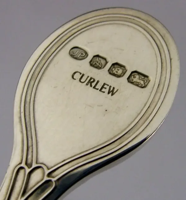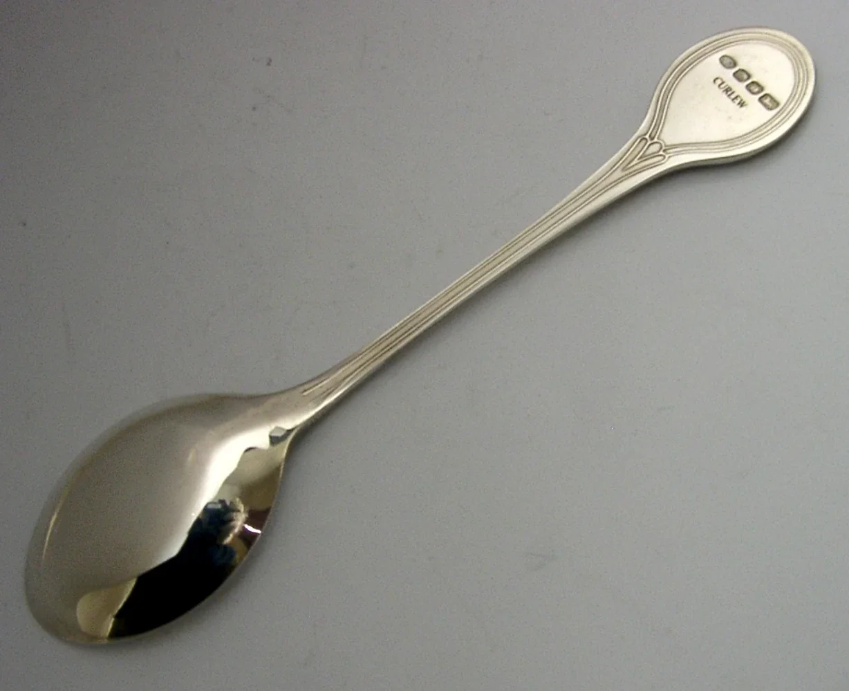 A very nice quality English solid sterling silver bird spoon. It is hallmarked for London 1975 with the makers marks being that of John Pinches (Medallists) Ltd. It has been nicely design having a gilded image of a Curlew to its terminal. It is in super condition being free from dings splits distortions and repairs. It measures approx. 5.25 inches (13.6cm) long by almost 1.25 inches (2.9cm) wide and weighs 27 grams. A beautiful example.
