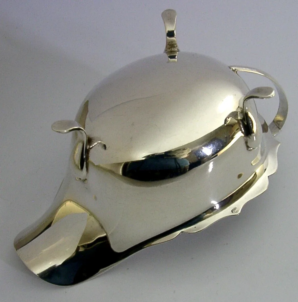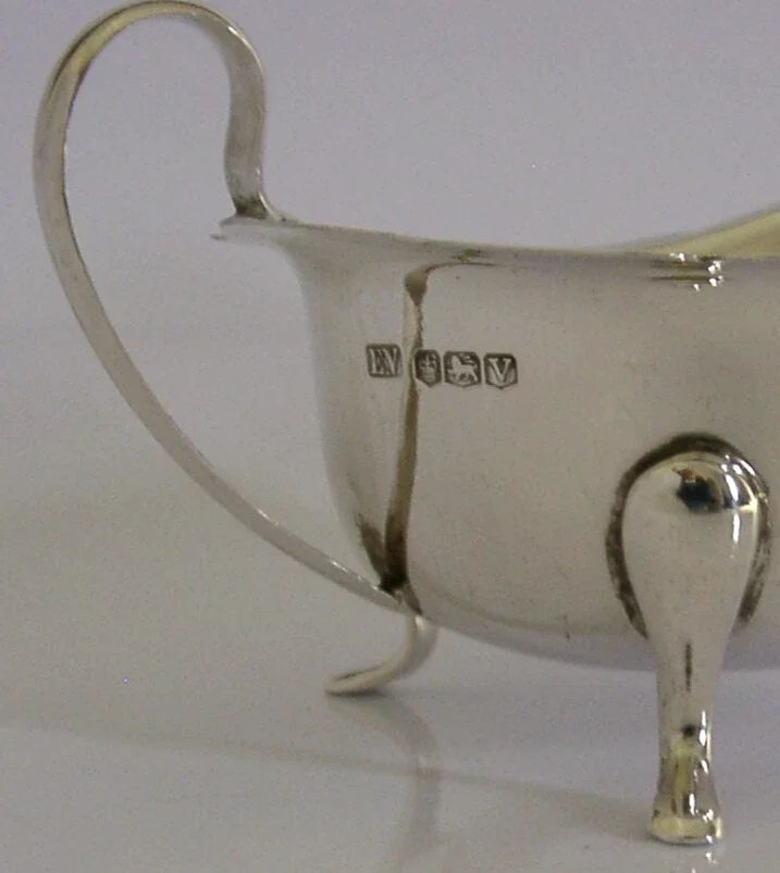 A beautiful high quality English solid sterling silver sauce boat / jug. It is hallmarked for Sheffield 1945 with the makers marks being EV. It has been superbly made and is in superb condition being free from dings splits holes and repairs, the inside is clean. It measures approx. 5.75 inches (15cms) including the handle by 3.5 inches (9cms) wide by almost 3 inches tall to the top of the handle. It weighs 116 grams. A well made piece.