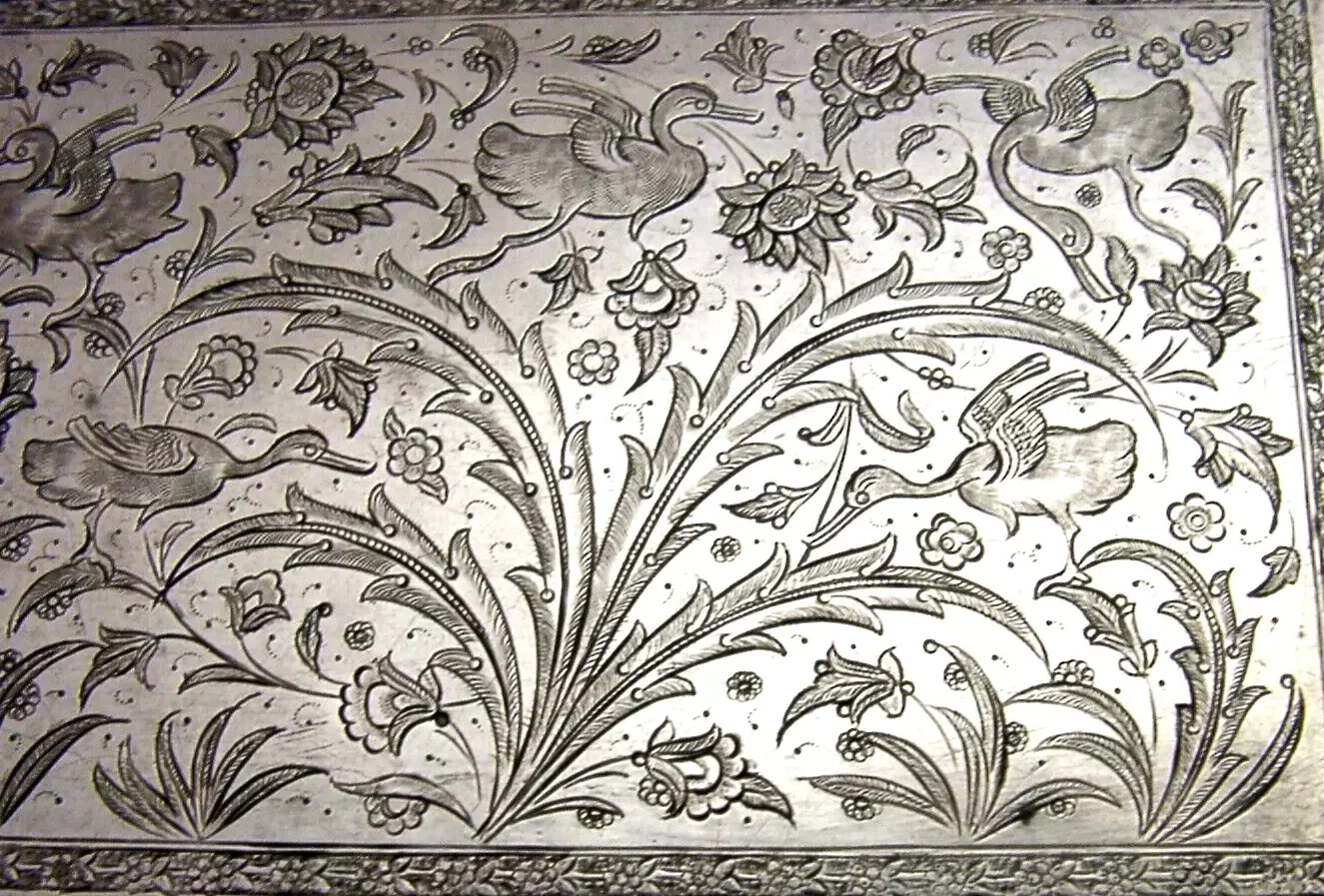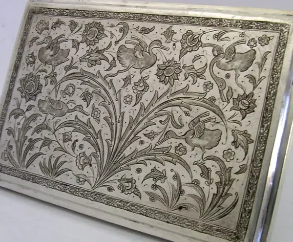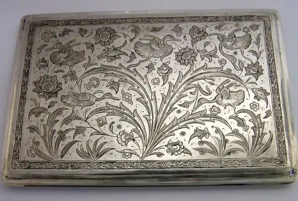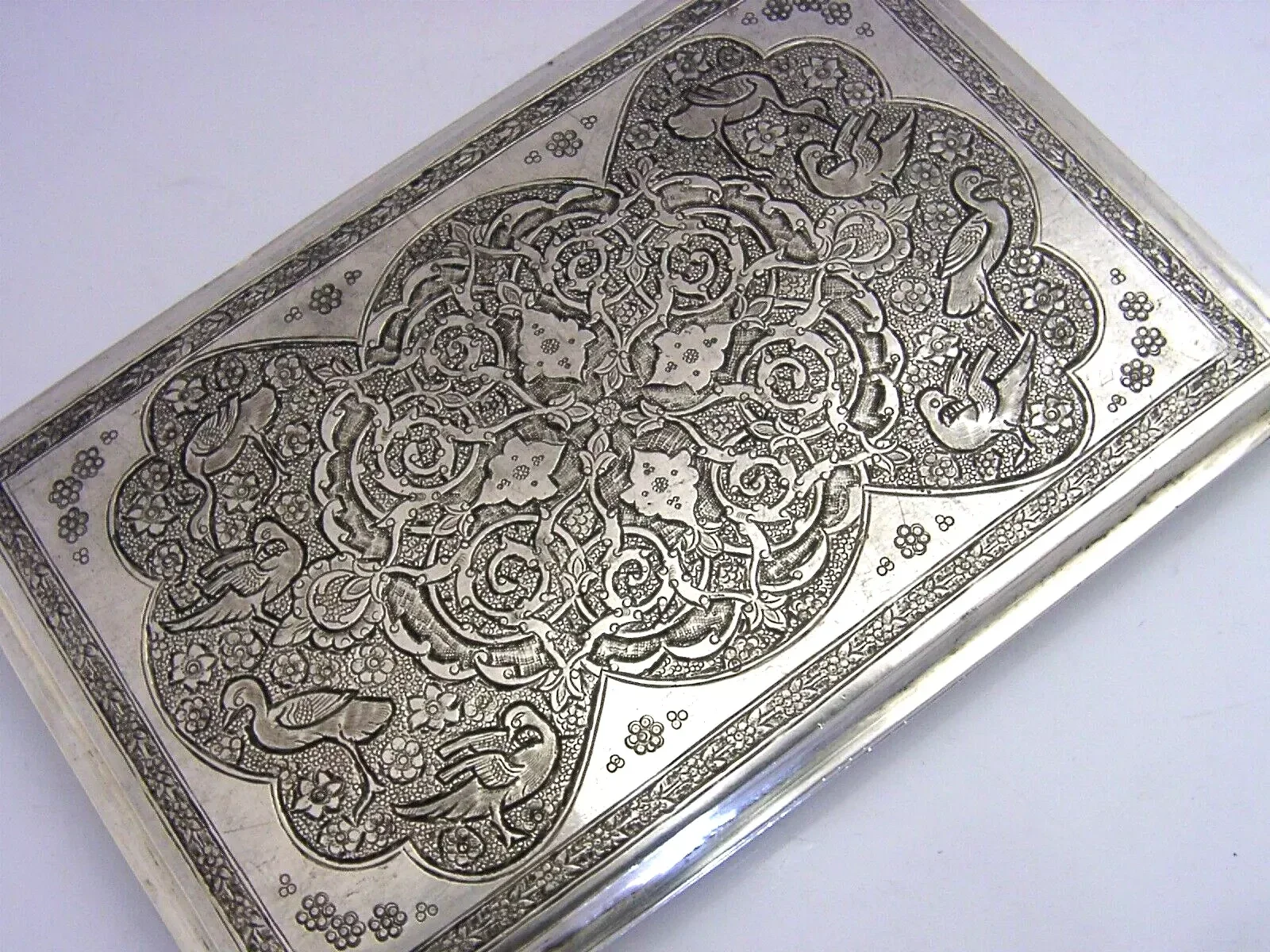 A beautiful solid silver Persian cigarette case. It is hallmarked with Persian silver marks and tests as 840 grade silver. I would date it to c1920-1940. It has been beautifully hand made being engraved and chased with a duck like birds. It is in superb condition being free from dings splits holes and repairs. It is sprung so automatically closes. The inside is clean and gilded. It measures 4.75 inches (12.3cm) long by 3.25 inches (8.3cm) wide and weighs 176 grams. A superbly designed beautiful example.