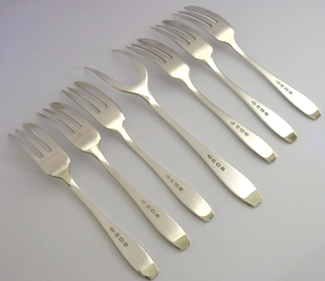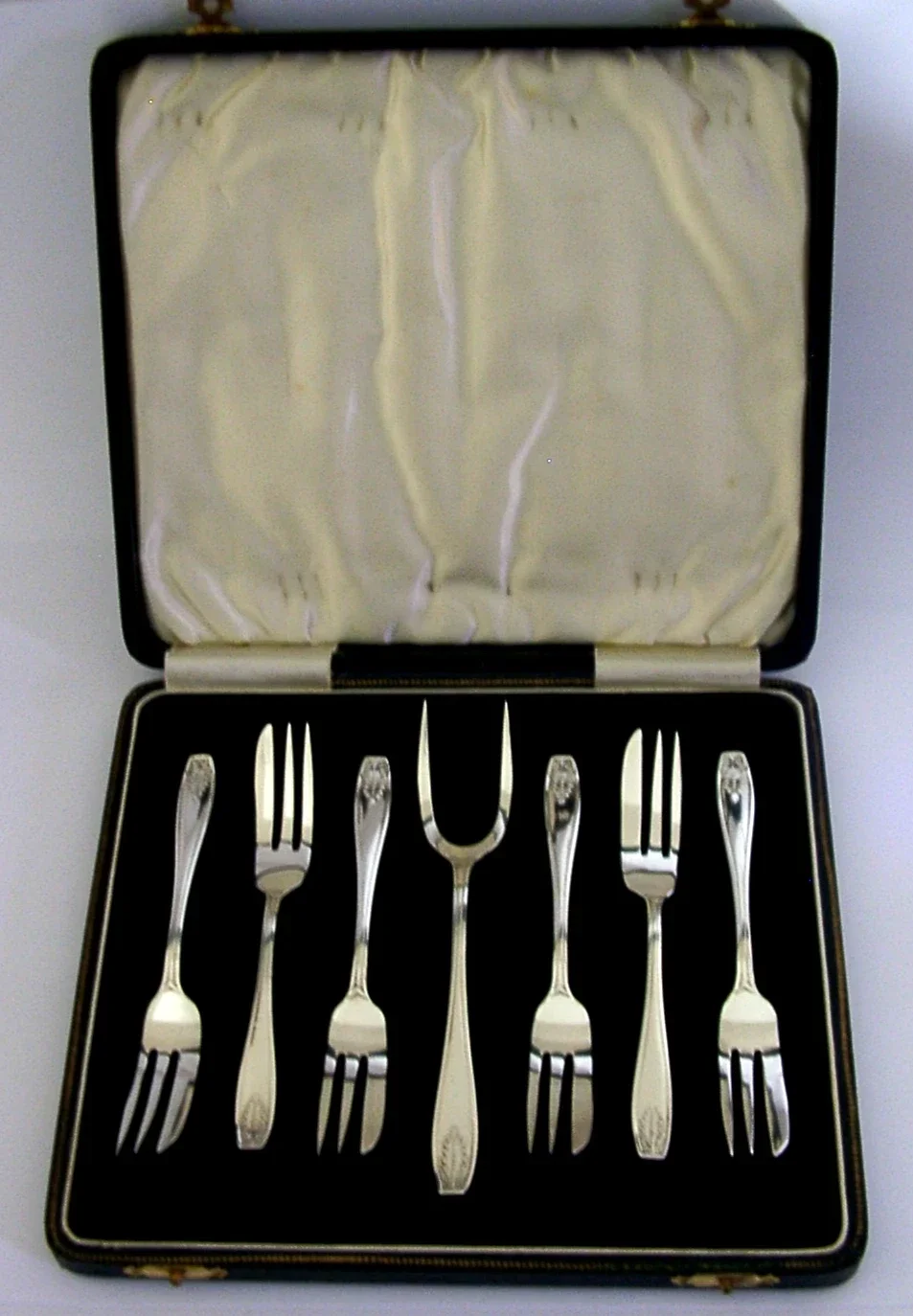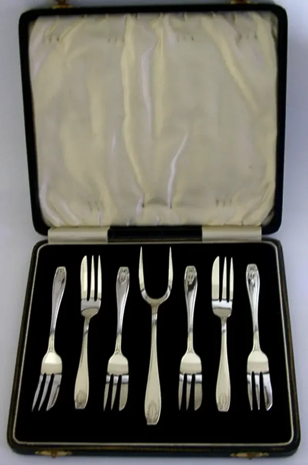 A beautiful cased set of six English solid sterling silver cake or pastry forks and server. They are hallmarked for Birmingham 1936 with the maker being AP&Co. They have been beautifully designed and are in superb condition being free from dings splits and repairs. They measure approx. 5 inches (12.5cm) long by 0.5 inch (1.4cm) wide (the server slightly larger) and have a combined weight of 120 grams, excluding the case. A beautifully made set.