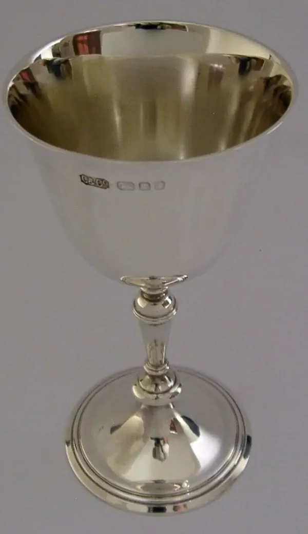 A beautiful heavy English solid sterling silver wine goblet. It is hallmarked for London 1966 with the makers marks being that of Carrington & Co. It has been superbly designed and holds 120ml. It is in superb condition being free from dings splits distortions and repairs. It measures approx. 5.75 inches (14.6cm) tall by 3 inches (7.6cm) across the rim by 2.75 inches (6.8cm) across the base and weighs 180 grams. A very good quality well made piece.
