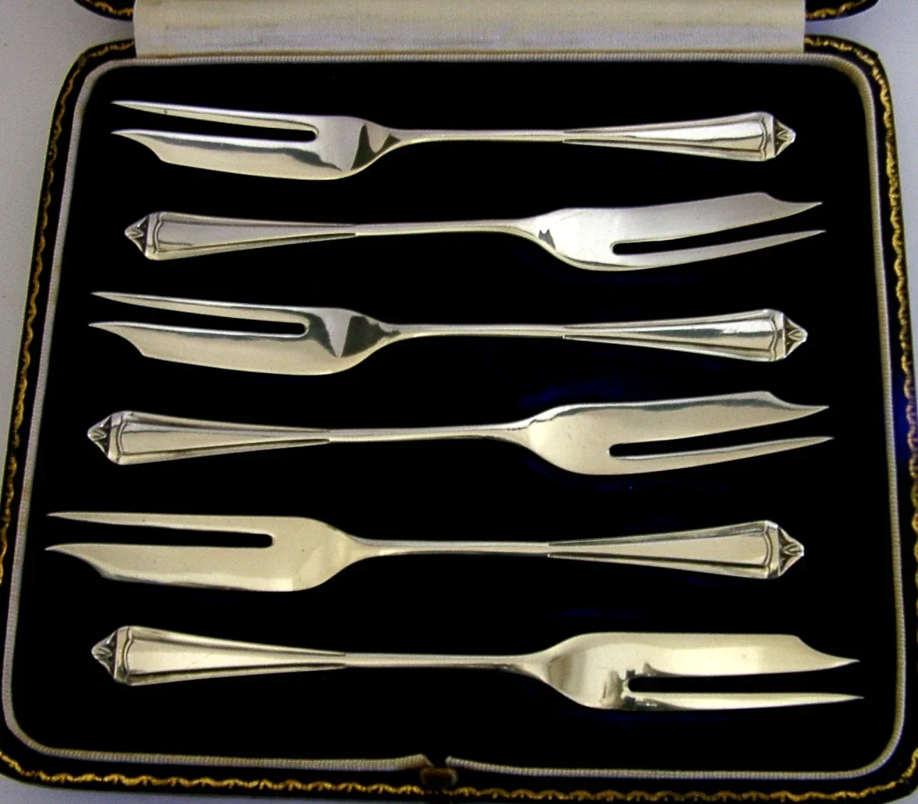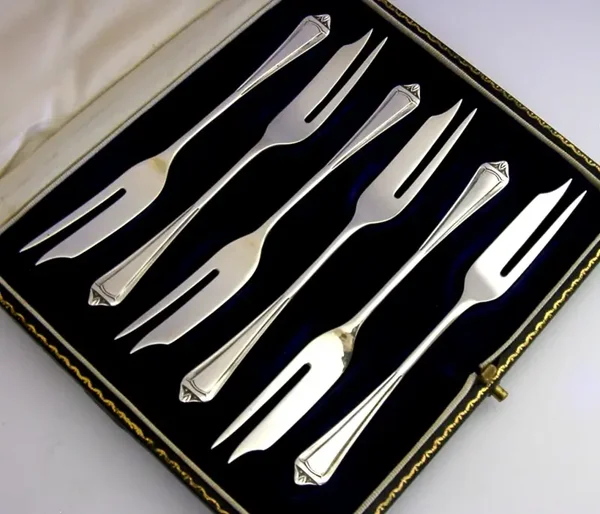 CASED SIX ENGLISH STERLING SILVER CAKE PASTRY FORKS 1941 ART DECO 72g