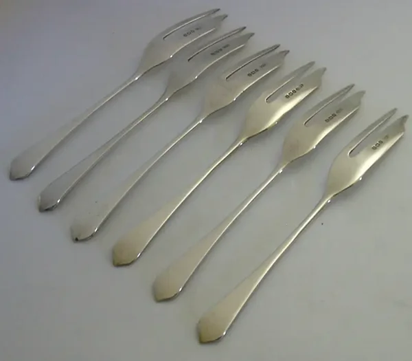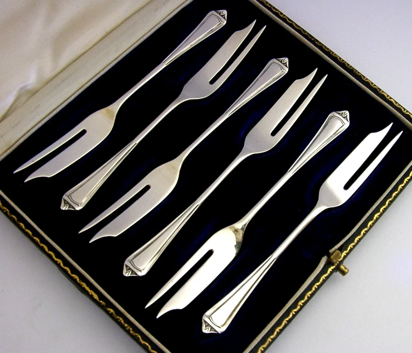 A beautiful cased set of six English solid sterling silver cake or pastry forks. They are hallmarked for Birmingham 1941 with the maker being Lanson Ltd. They have been beautifully designed and are in superb condition being free from dings splits and repairs, a scuff to the case. They measure approx. 5 inches (12.8cm) long by 0.5 inch (1.4cm) wide and have a combined weight of 72 grams, excluding the case. A beautifully made set.