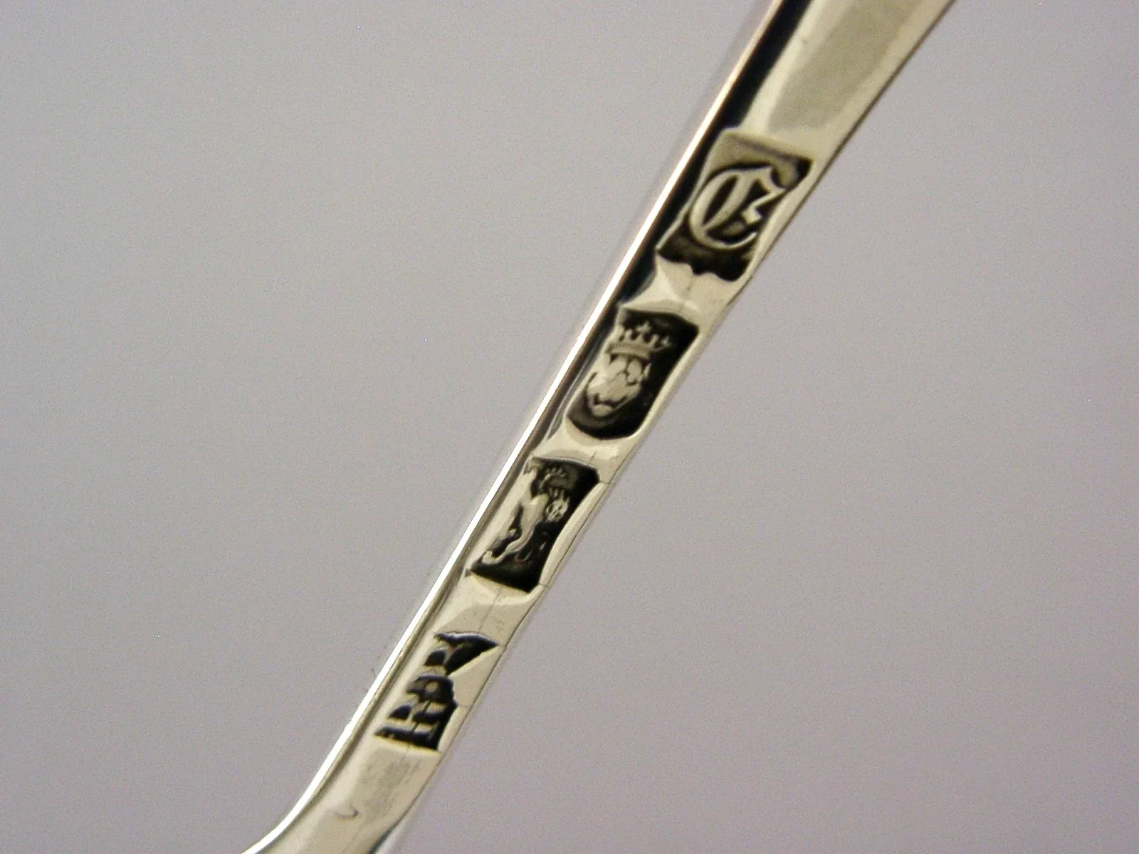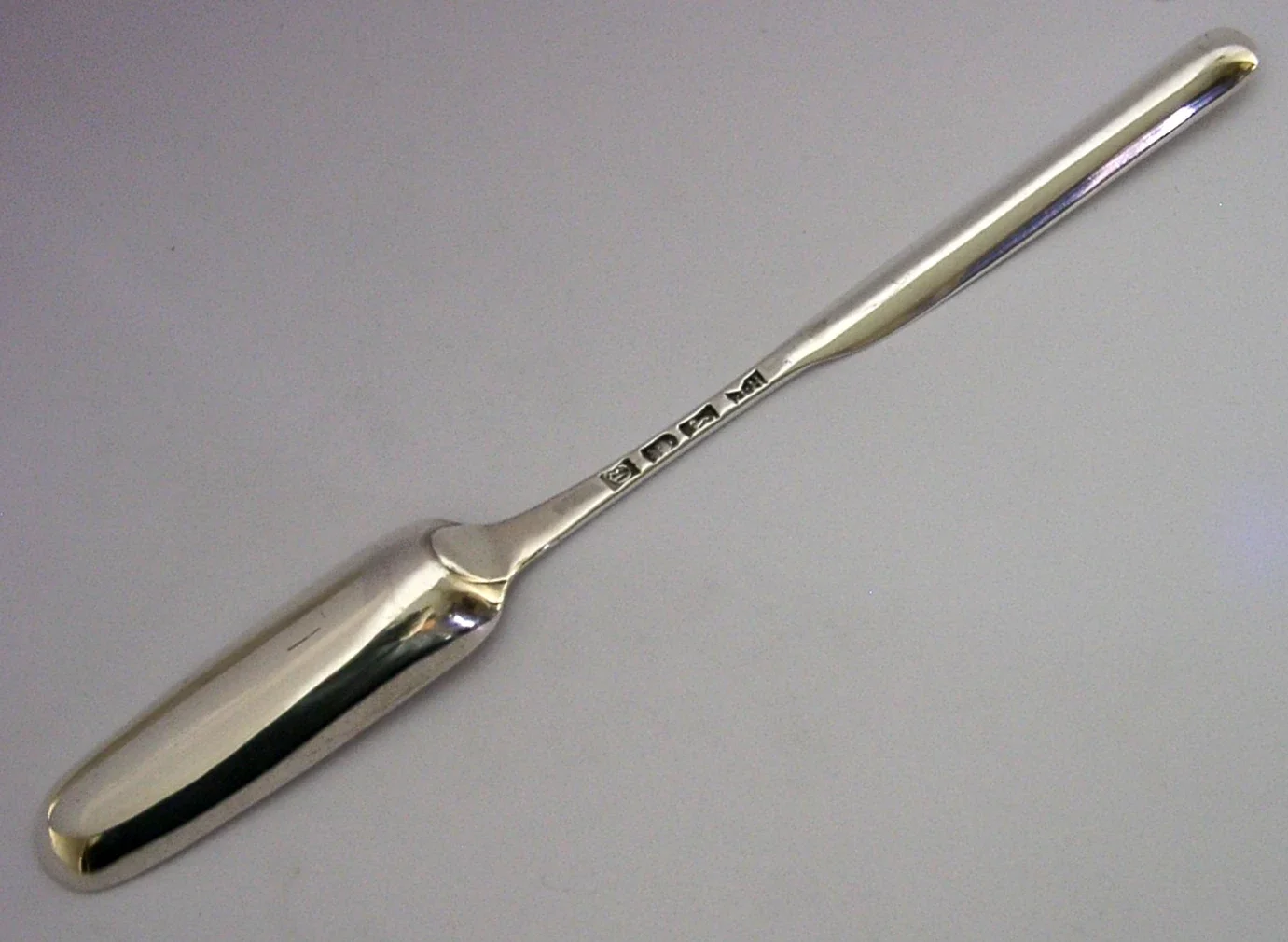 A rare early English Georgian antique solid sterling silver marrow scoop. It is hallmarked for London 1760 with the makers mark being RR. It has been superbly designed and is in super condition having no dings splits distortions or repairs. It measures approx. 8.75 inches (22cm) long by 1 inch wide and weighs 34 grams. A very high quality early piece.