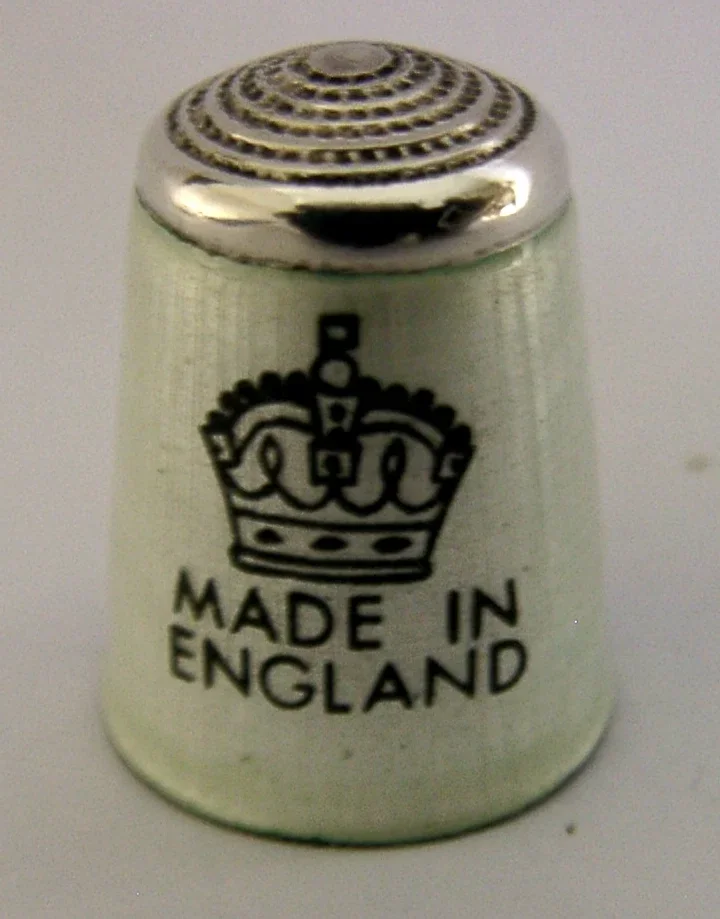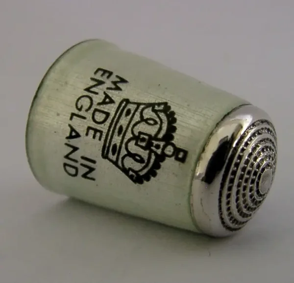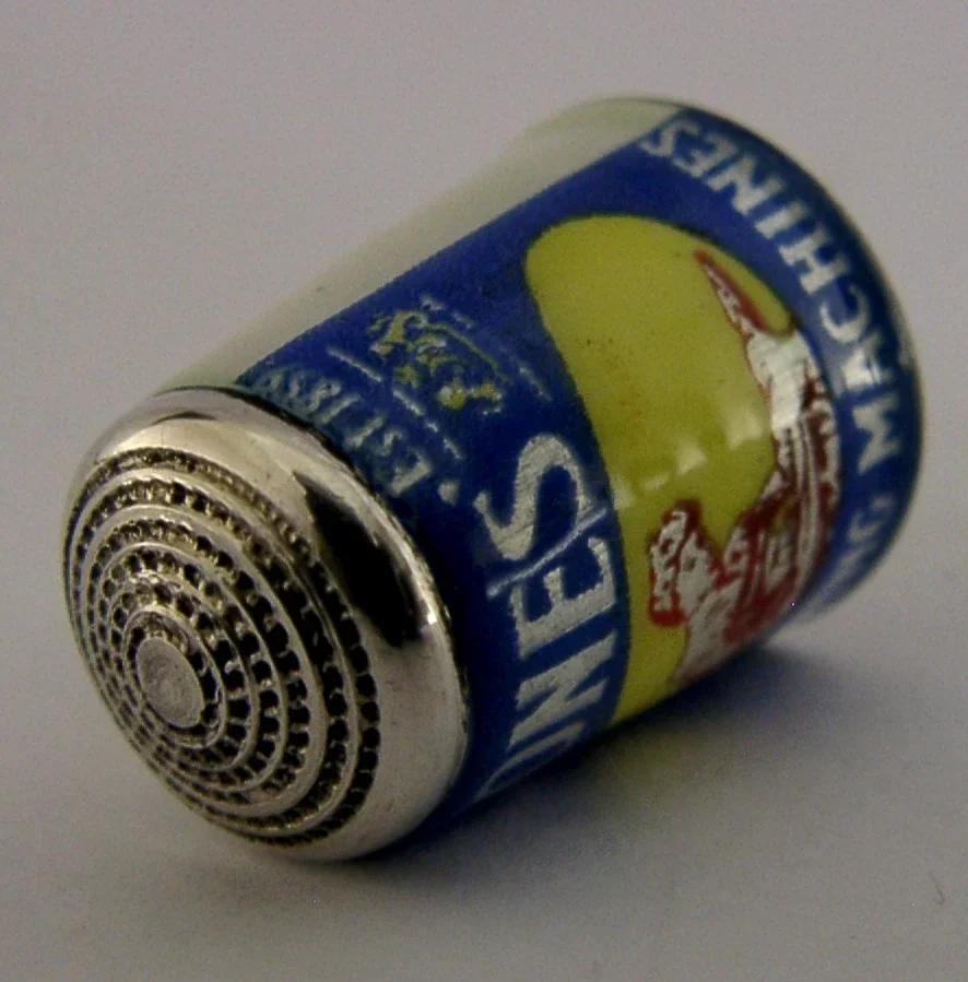 A beautiful solid sterling silver and enamelled thimble. It is hallmarked for Birmingham 1988 with the makers marks being JS&S. It has been superbly designed advertising Jones Sewing Machines. It is in super condition being free from dings splits holes and repairs. No chips or cracks. It measures approx. 1 inch (2.2cm) tall and weighs 5 grams. A very beautiful example.