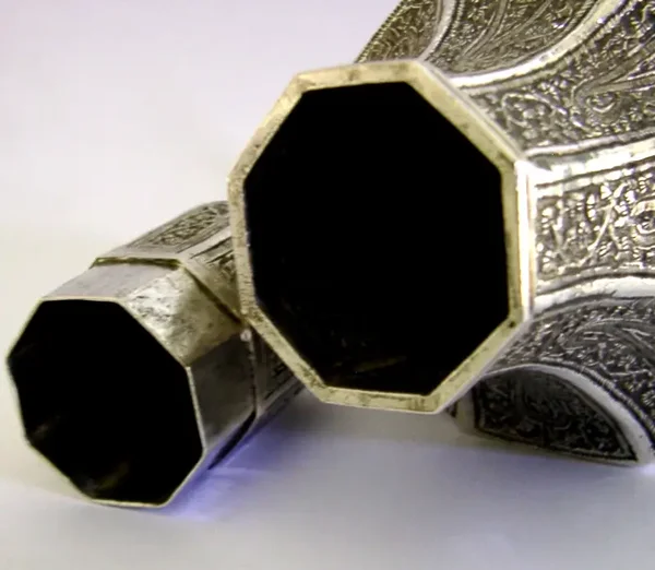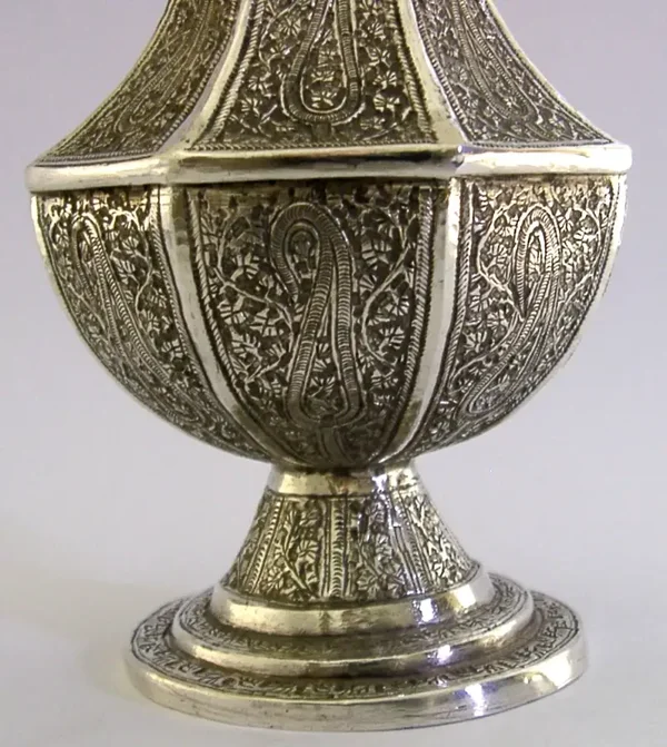 A beautiful large hand made Indian solid silver sugar caster shaker. It is unmarked but tests as high grade silver. I would date it to c1900 most likely made in the Kashmir region. It has been beautifully hand made and embossed and chased with a paisley type pattern. It is in superb condition being free from dings splits holes and repairs. It measures approx. 7.5 inches (19cm) tall by 3.75 inches (9.6cm) across and weighs 224 grams. A superbly designed unusual example.