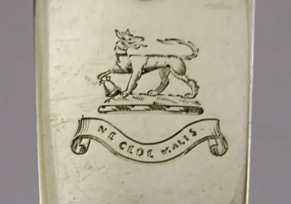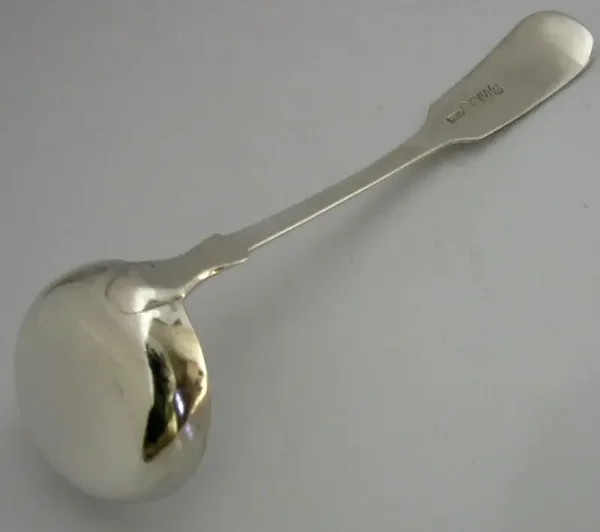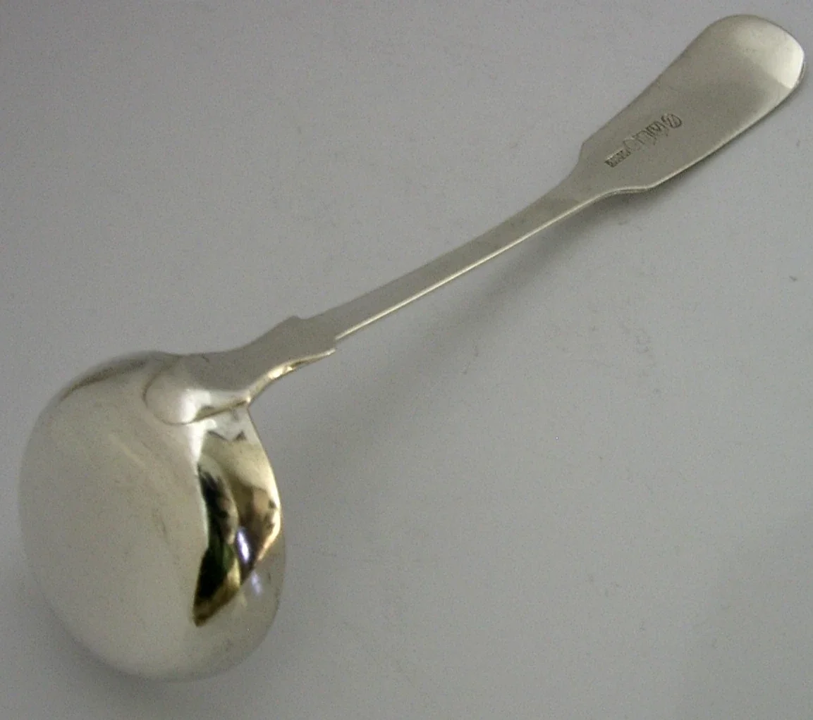 A very interesting Scottish solid sterling silver ladle. It is hallmarked for Edinburgh 1856 with the makers marks being JMCo. It has been superbly made being engraved with the crest and moto used by the Tolhurst Family, the crest being recorded as belonging specifically to Alfred Tolhurst Esquire of Gravesend Kent so how it got all the way from Scotland is a mystery. It is in superb condition being free from dings splits and repairs. It measures approx. 6 inches (15cm) long by 1.75 inches (4.5cm) wide and weighs 38 grams. A high quality very interesting piece.