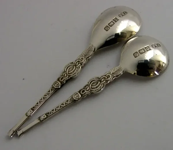 An unusual pair of solid sterling silver spoons. They are hallmarked for Birmingham 1975 with the makers marks being T&S. They have been unusually designed in the form of the Royal Anointing Spoon used at coronations. They are in super condition being free from dings splits distortions and repairs. The longest measures approx. 2.75 inches (7cm) long and they weigh 7 grams combined. Unusual examples.
