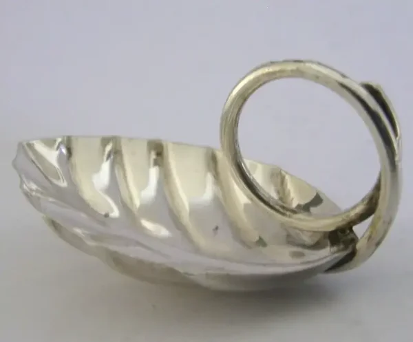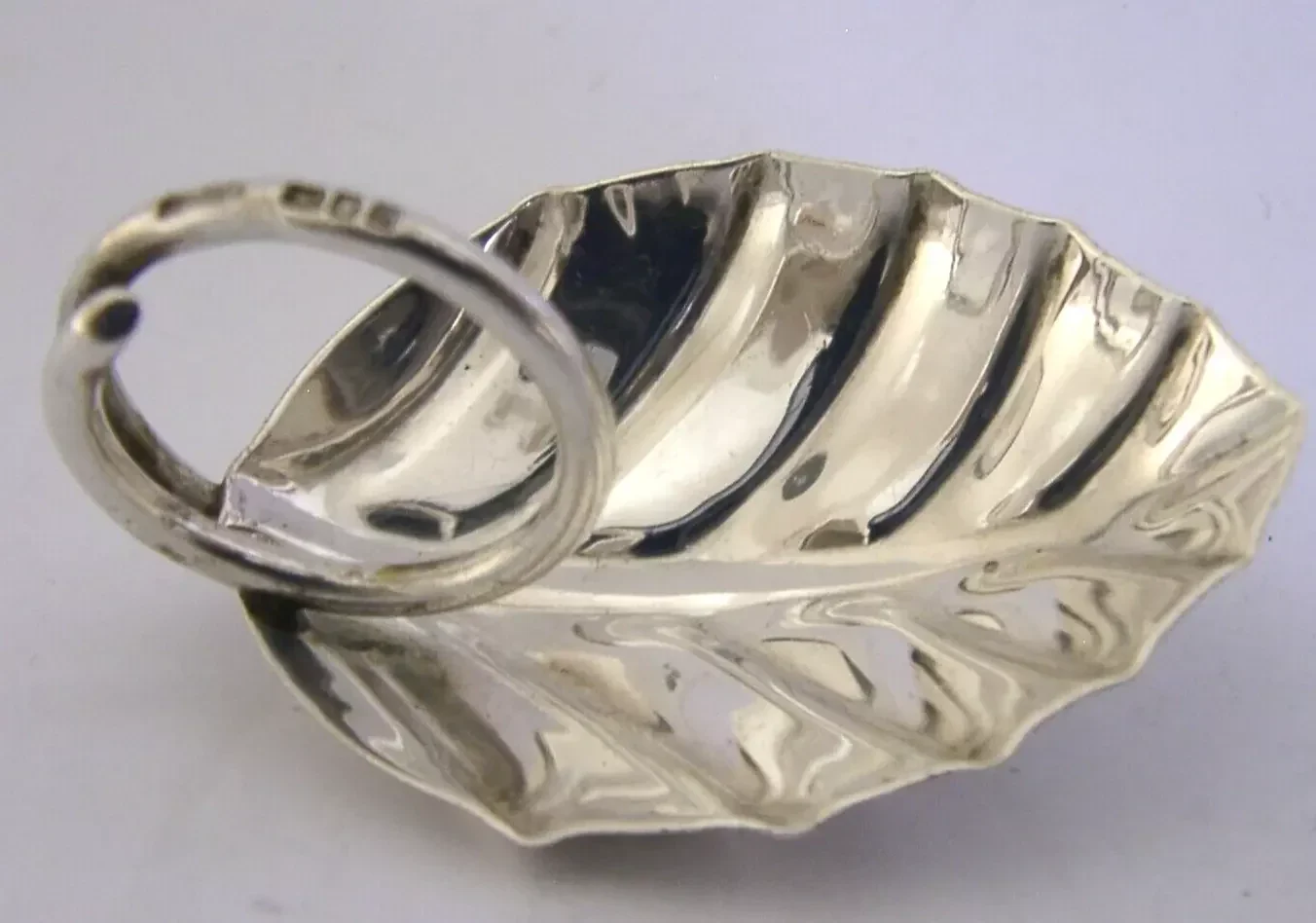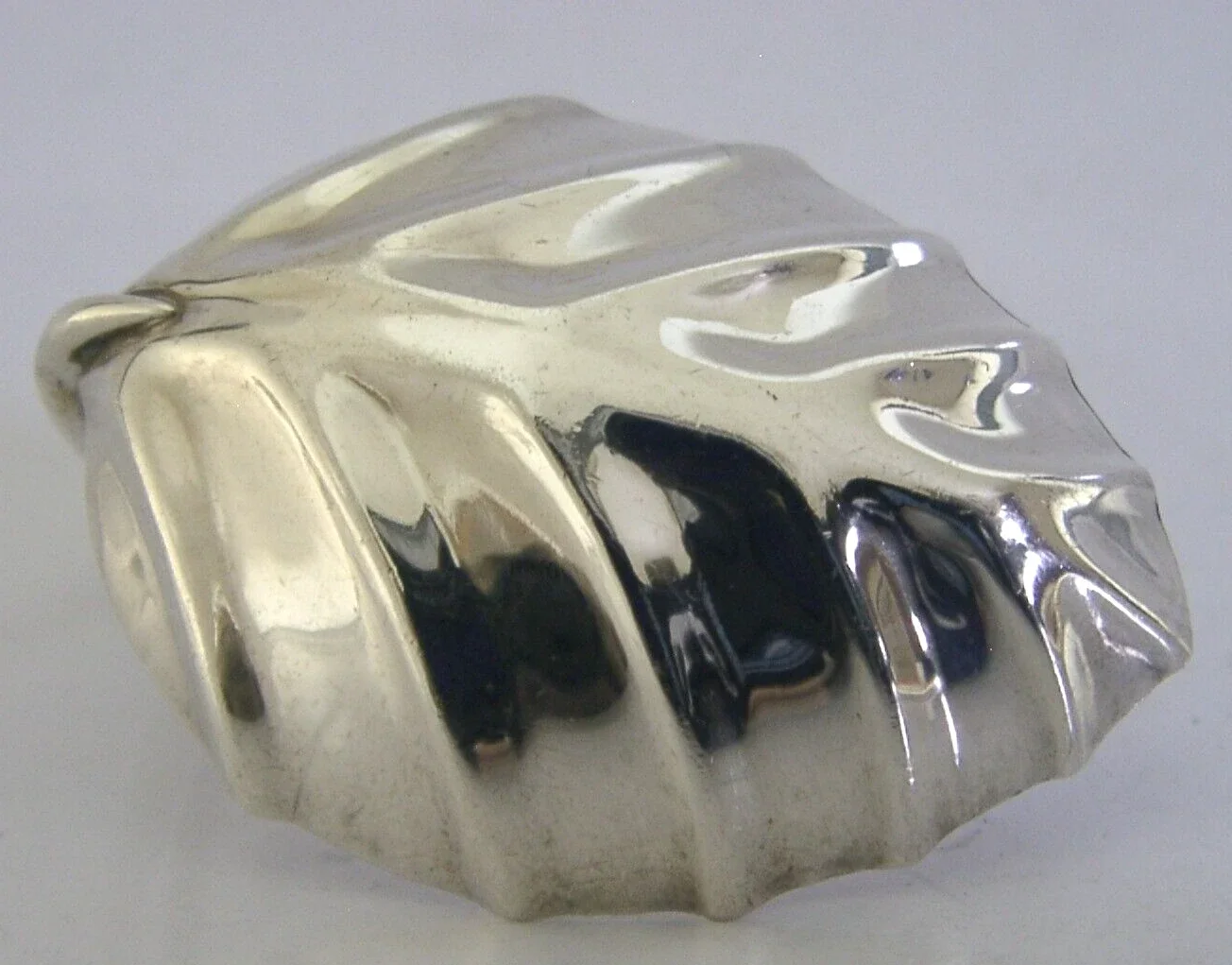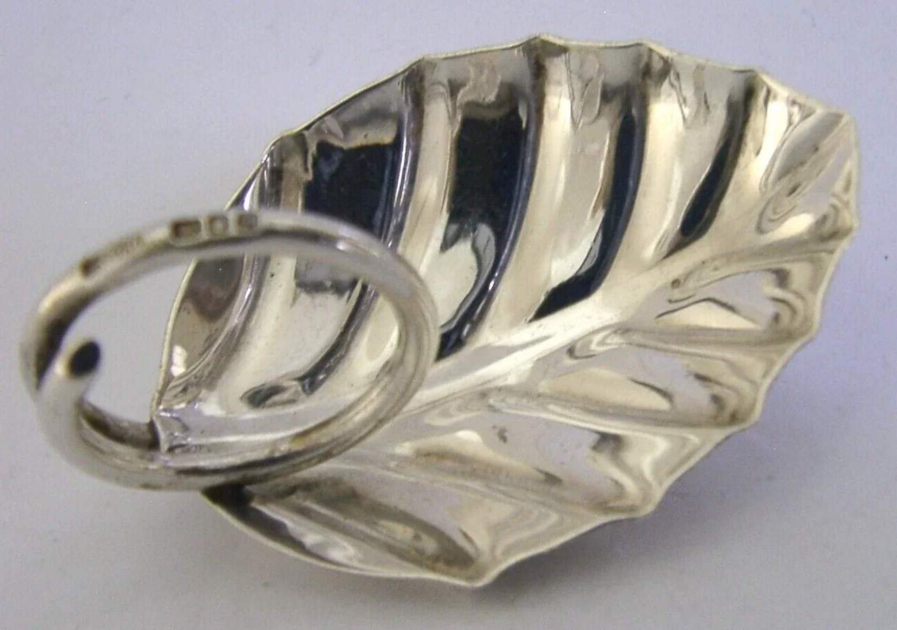A super quality unusual English solid sterling silver caddy spoon. It is hallmarked for London 1957 with the maker being Geoffrey Guy Bellamy. It has been superbly made being in the form of a leaf. It is in super condition being free from dings splits distortions and repairs. It measures approx. 2 inches (5.4cm) across by 1.5 inches (3.8cm) wide by 1.25 inches (3.2cm) tall and weighs 10 grams. A very nice clean example.