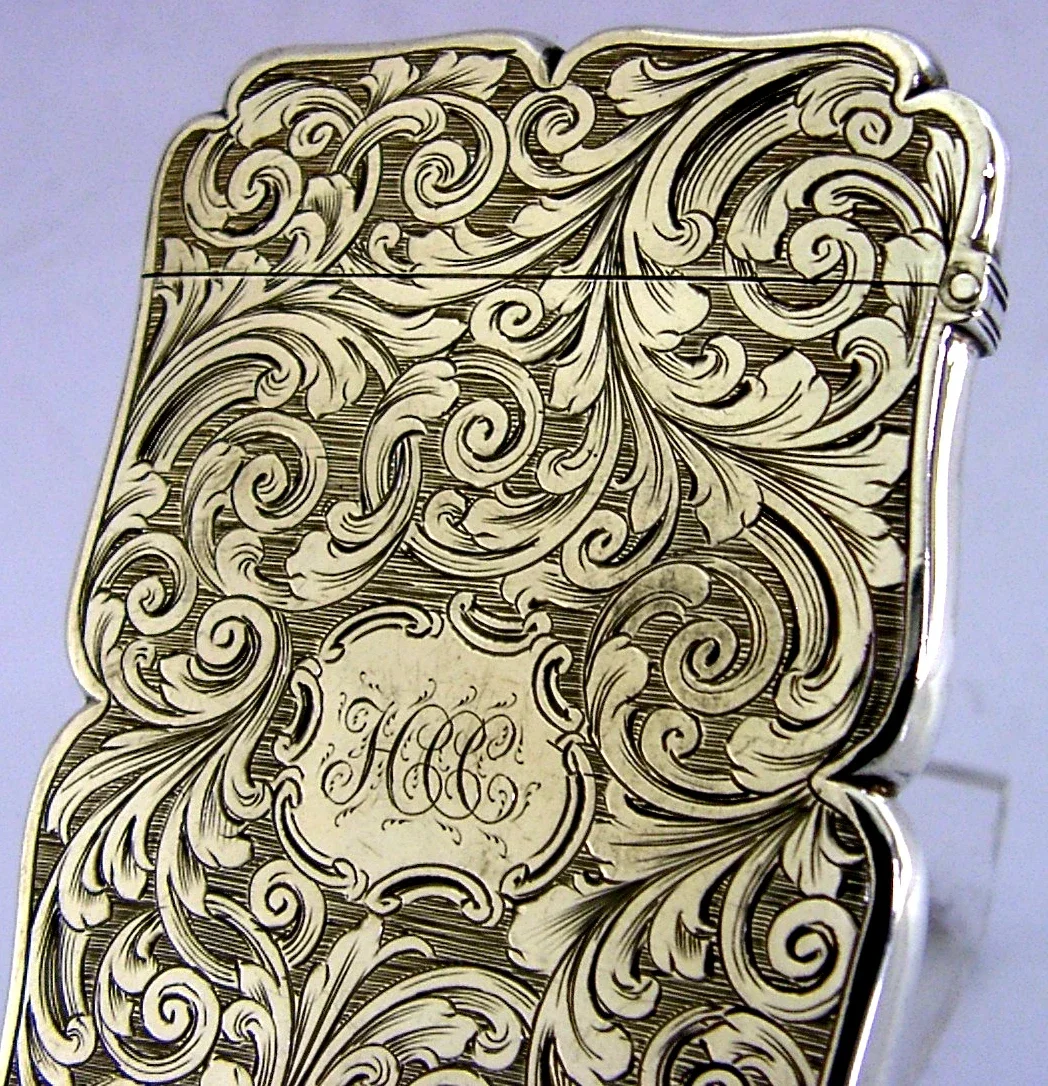 A beautiful mint sterling silver early Victorian card case. It is hallmarked for Birmingham 1855 with the makers mark being that Edward Smith. It has been superbly made been finely engraved with the cartouche bearing the initials HCC. Note it is left handed - the hinge being on the right. It is in superb condition being free from dings splits holes and repairs. It closes surely. It measures 3.25 inches (8.3cms) tall by 2 inches (5.2cms) wide and weighs 36 grams. A superbly designed beautifully clean example.