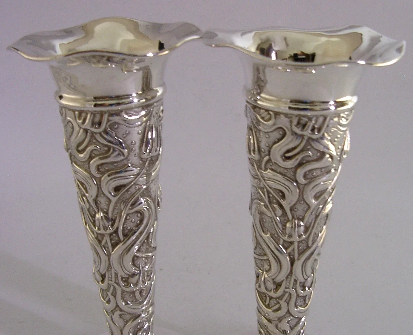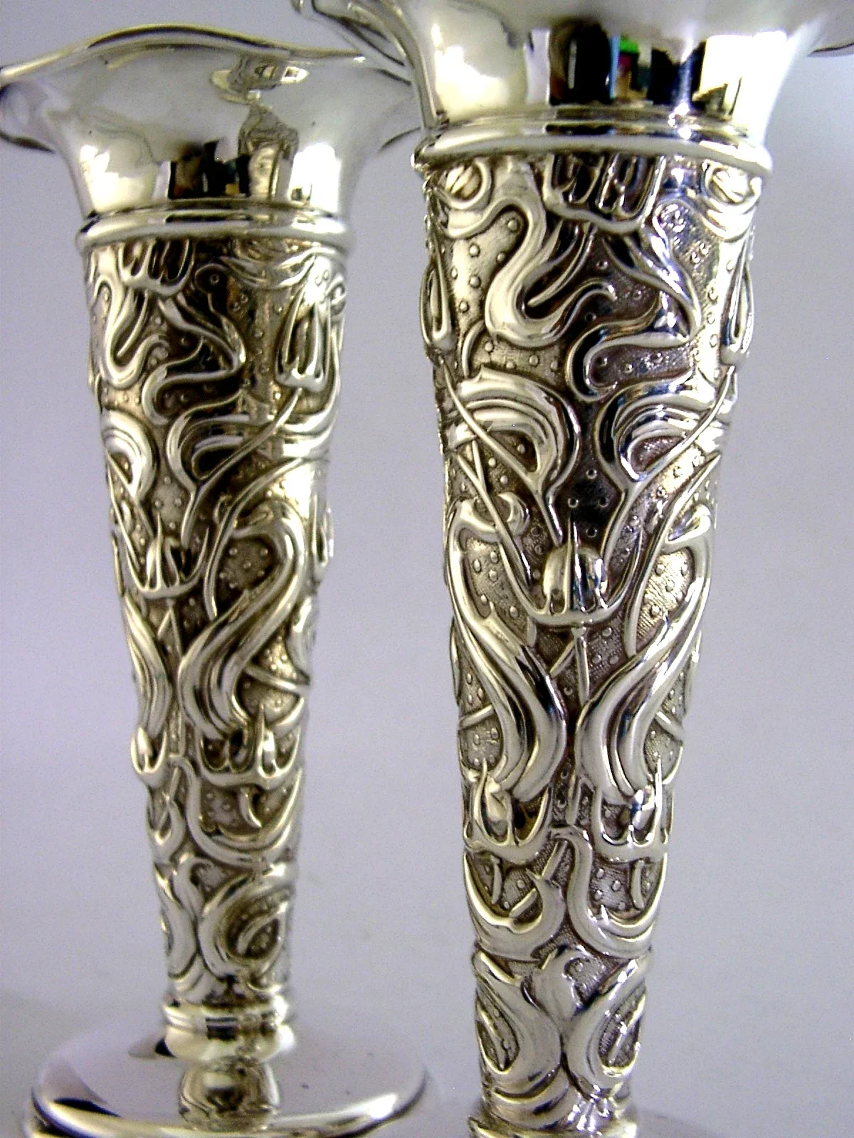 STUNNING ENGLISH ANTIQUE STERLING SILVER VASES ARTS & CRAFTS ART NOUVEAU 1903