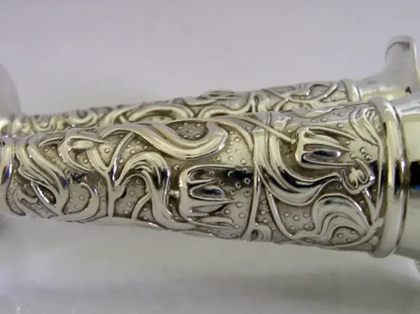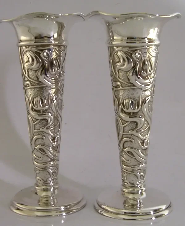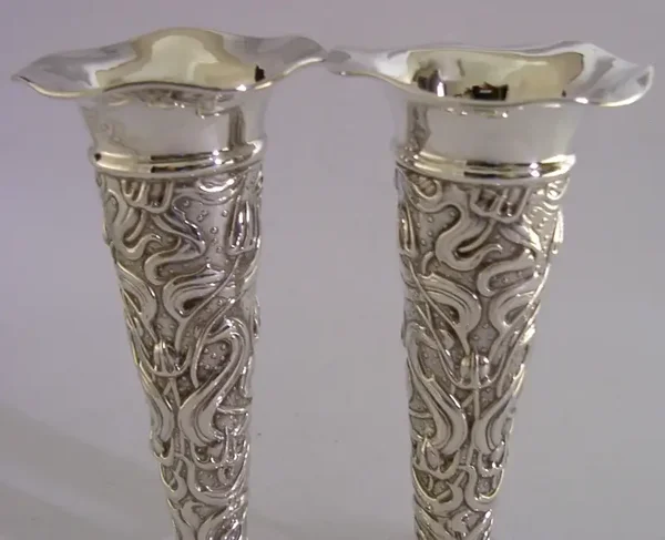 A stunning pair of English antique solid sterling silver vases. They are hallmarked for Birmingham 1903 with the makers marks being William Hutton. They have been superbly made being beautifully shaped and embossed and are in superb condition being free from dings splits holes and repairs. They measures over 5 inches (13cm) tall by 2.5 inches wide and combined weigh 157 grams with a tiny bit of weighting in the base - see photo. Stunning.