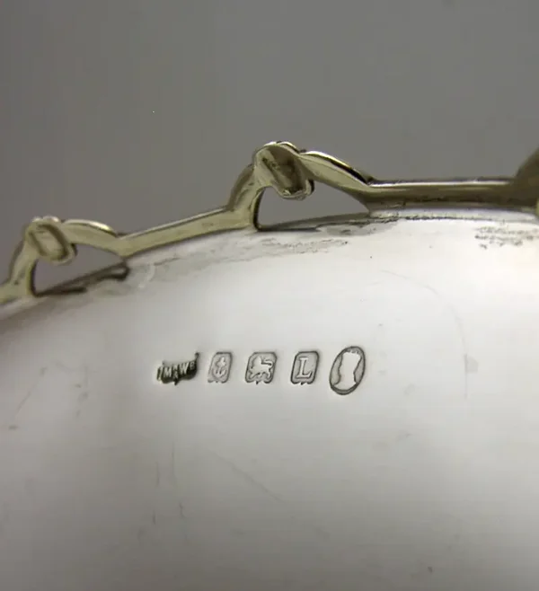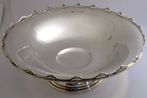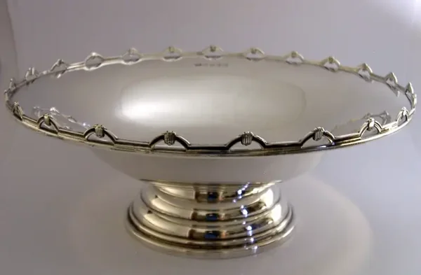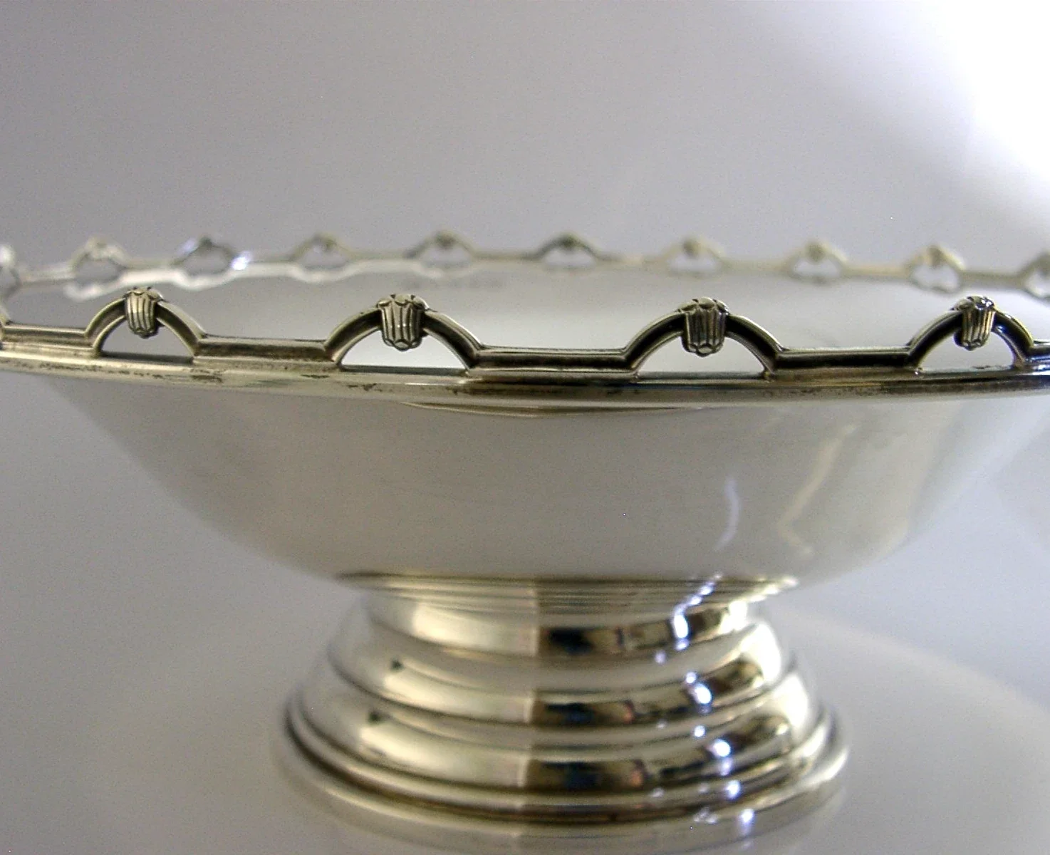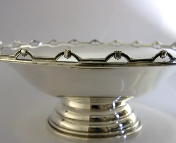 A stunning heavy antique solid sterling silver dish or bowl. It is hallmarked for Birmingham 1935 with the makers marks being Mappin and Webb. It has been beautifully made having an angular pierced boarder and stepped base. It in superb condition being free from dings splits and repairs. It measures approx. 8.5 inches (21.7cms) across by 3.5 inches tall and weighs 338 grams. A stunning piece.
