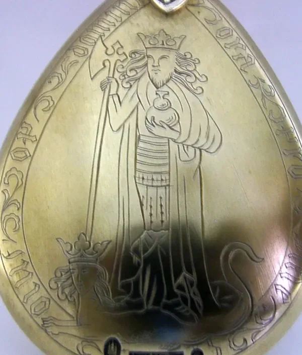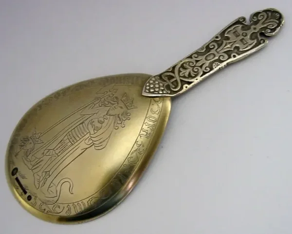 A beautiful Danish antique solid sterling silver gilt baptism or christening spoon. It is hallmarked with the Danish Copenhagen three towers mark for 1897 along with a makers mark. It has been beautifully designed most likely a copy of a Medieval piece and completely gilded. It is in super condition being free from dings splits distortions and repairs. It measures approx. 6 inches (15cm) long by 2.5 inches (6.4cm) wide and weighs 57 grams. A beautifully made piece.