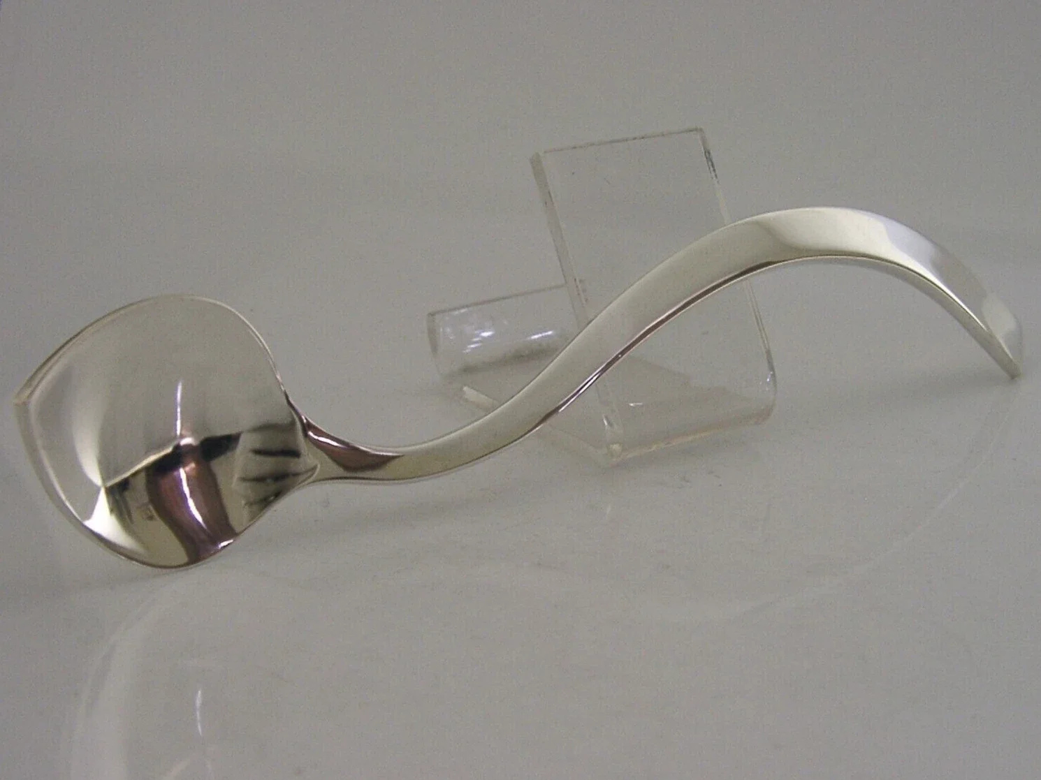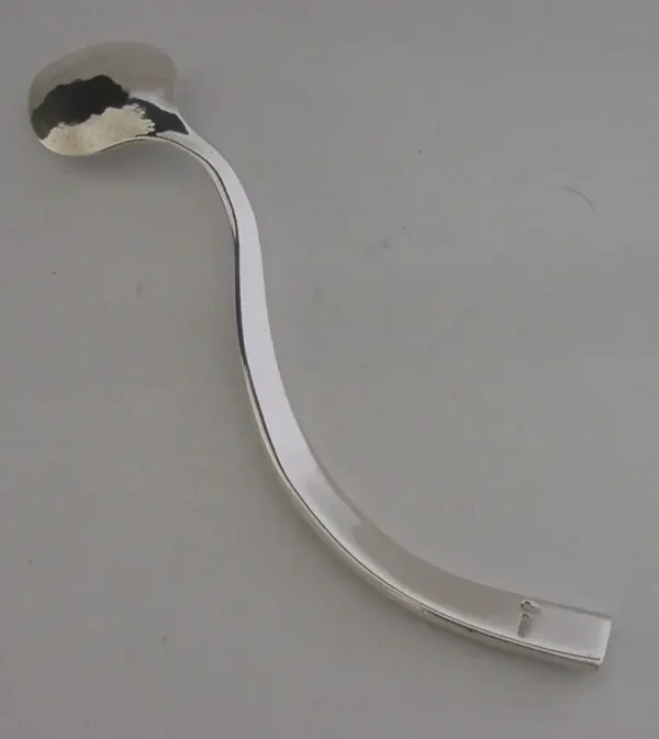 A beautiful hand made English solid sterling silver spoon. It is hallmarked with a makers mark MDHC but the rest are difficult to decipher, I would date it to c1980s, it tests as sterling silver. It has been superbly hand made having a curved snake like design with a hand plannished bowl back. It is in super condition having no dings splits distortions or repairs. It measures approx. 7 inches (17.8cm) long by 1.25 inches (3.3cm) wide and weighs 50 grams. A very high quality piece.