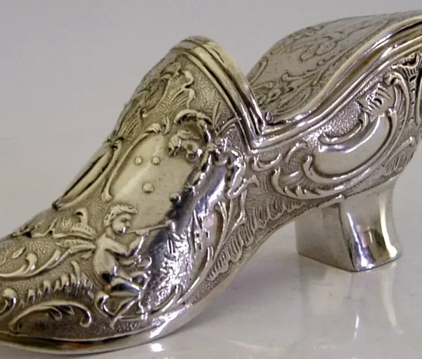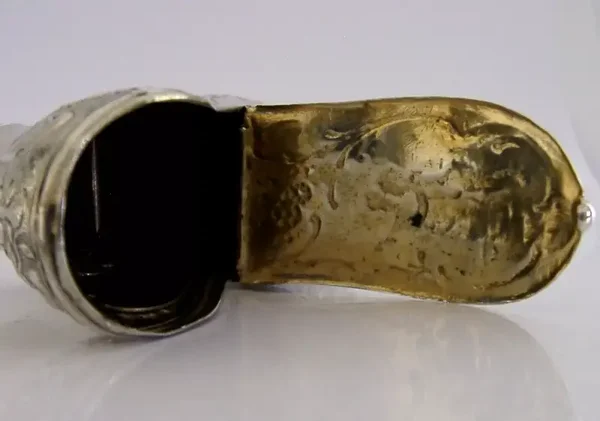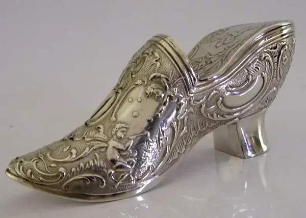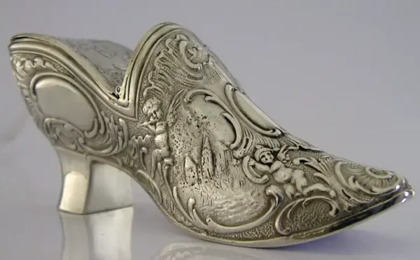 A beautiful good sized German Hanau solid silver box. It is hallmarked with a German Hanau makers mark and tests as high grade silver, I would date it to c1900. It has been superbly designed being in the form of a shoe. It is in super condition being free from dings splits holes and repairs, gilded inside. The lid closes tightly. It measures approx. 4.25 inches (11cms) long by 1.75 inches (4.8cm) tall and weighs 60 grams. A very pretty piece.