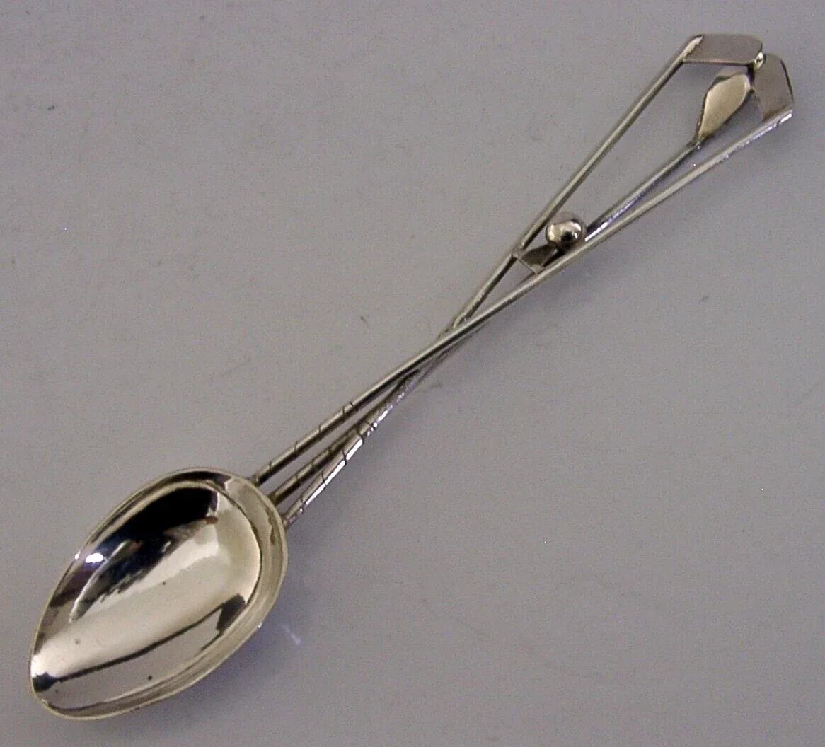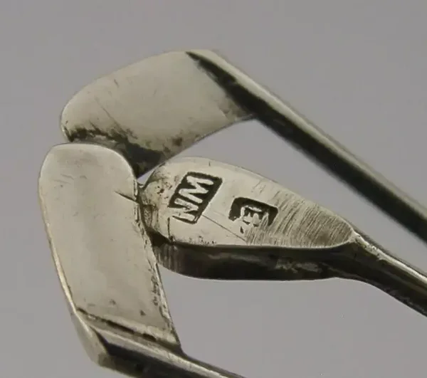 A rare antique Chinese export solid silver spoon. It is hallmarked with a Chinese character mark and the makers mark of Wing Nam & Co who operated in Hong Kong late 19th century - early 20th century, it tests as high grade silver. It has been superbly designed with the handle being in the form of three golf clubs. It is in super condition being free from dings splits and repairs, small cracking to the rear club but these don't go through - see final photo. It measure approx. 5.25 inches (13.2cm) long by 1 inch (2.6cm) wide and weighs 14 grams. A rare piece.