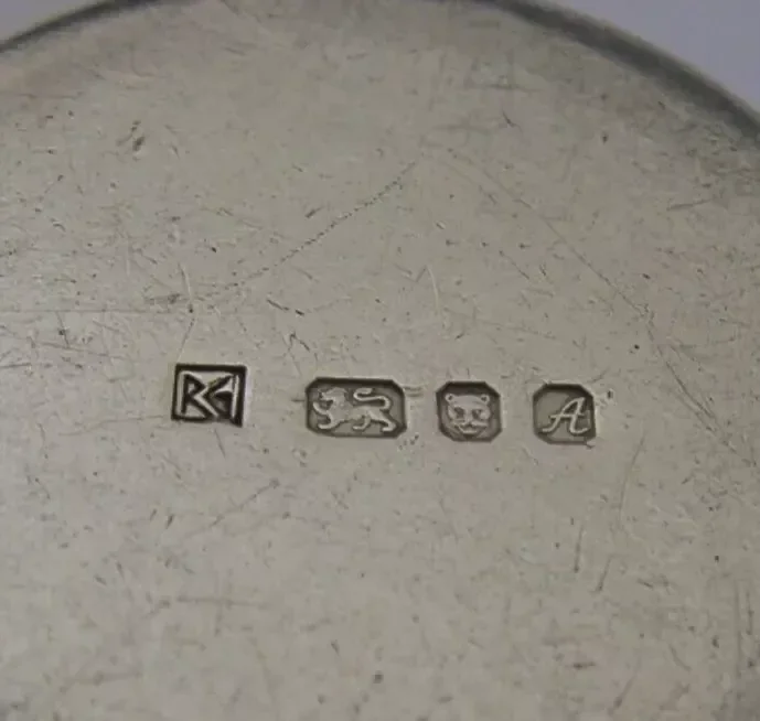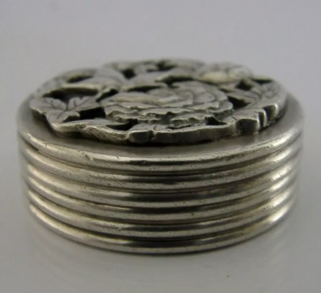 A beautiful English solid sterling silver pill desk box. It is hallmarked for London 1975 with the maker being that of the designer Robert Glover. It has flowers and butterfly decoration to its lid. It is in superb condition being free from dings splits holes and repairs. It measures approx. 1.25 inches (3.2cm) across by 0.5 inch (1.2cm) tall and weighs 26 grams. A very nice quality piece.