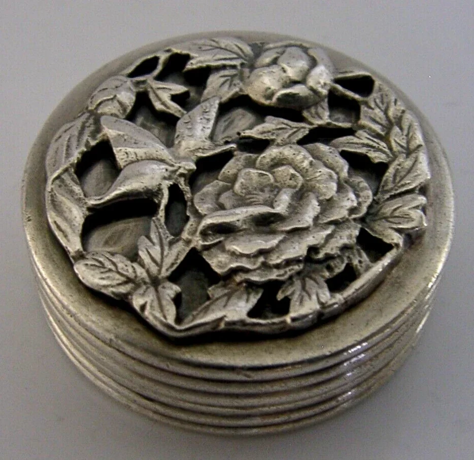 ENGLISH STERLING SILVER FLOWERS BUTTERFLY PILL DESK BOX 1975 ROBERT GLOVER