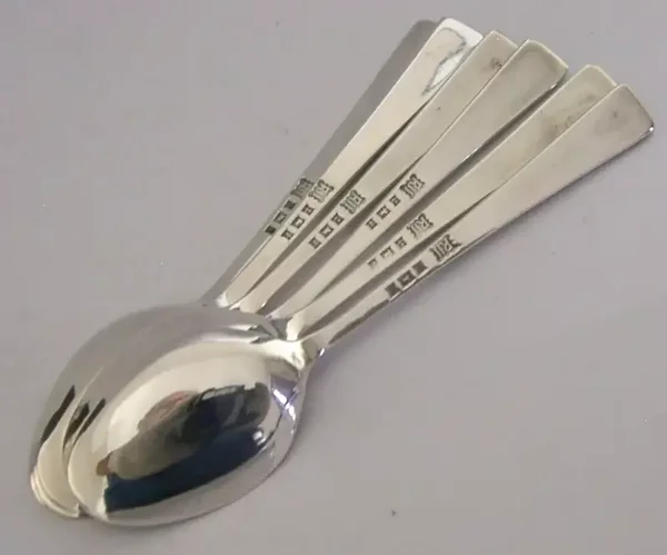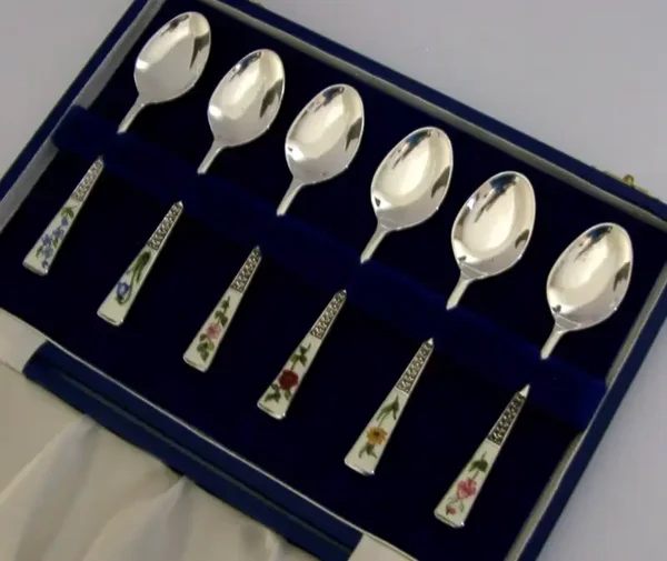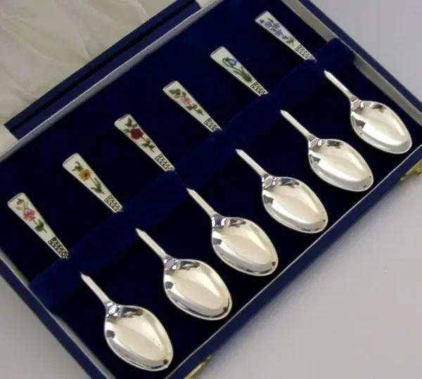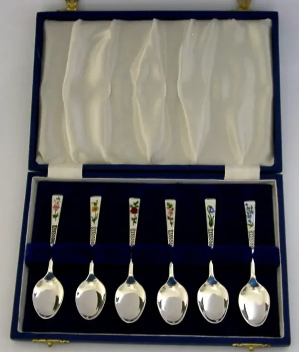 A beautiful cased set of six solid sterling silver and enamel spoons. They are hallmarked for Birmingham 1970 with the maker being The Royal Irish Silver Co. They have been beautifully designed having enamelled terminals and different hand painted flowers. They are in superb condition being free from dings splits and repairs, no chips or cracks to the enamel. They measure approx. 3.75 inches (9.6cm) long by over 0.75 inch (2.2cm) wide and have a combined weight of 54 grams, excluding the case. A beautifully made set.