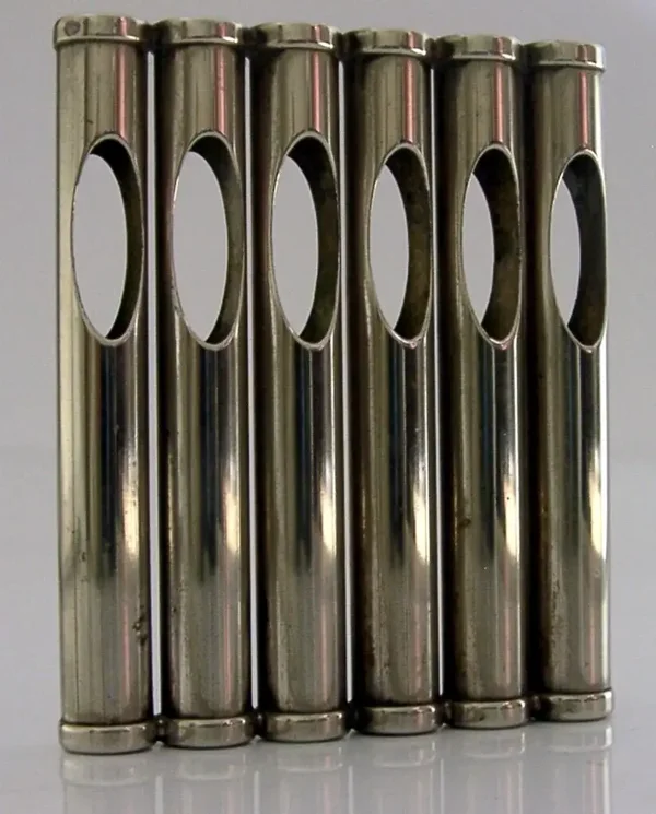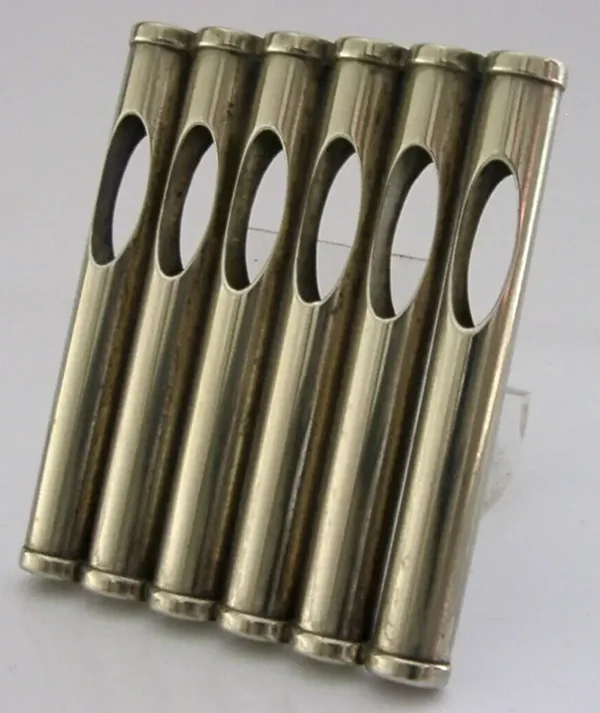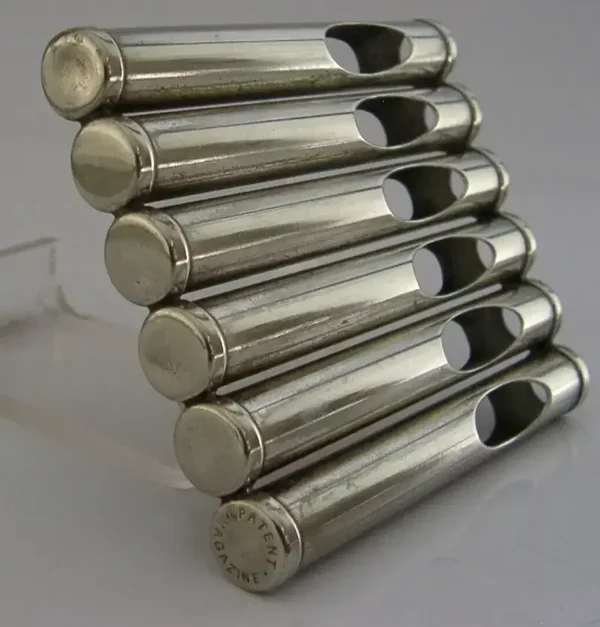 A very interesting and rare English antique silver plate cigarette case. It is marked MAGAZINE PATENT and dates to c1910. It has been designed in the form of a gum magazine. It is in good condition being free from splits holes and repairs, slight base marks. It measures almost 3 inches (7.3cm) tall by 2.25 inches (6cms) wide and weighs 38 grams. A very interesting example.