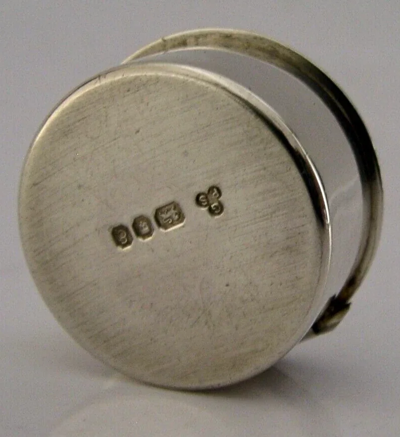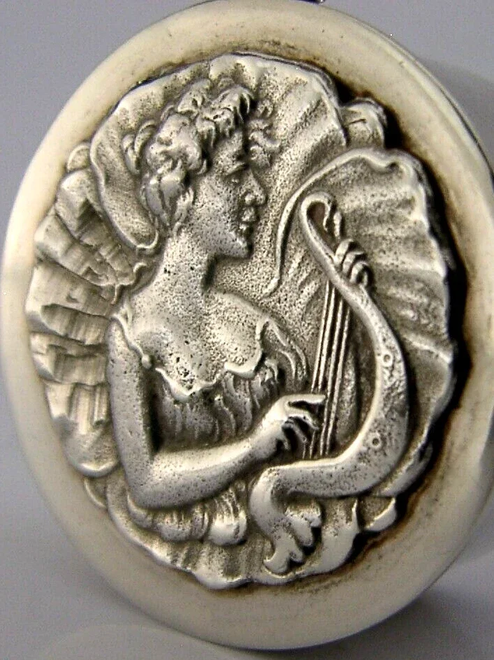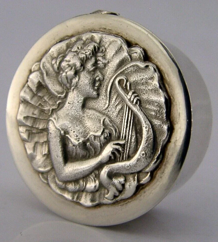 A superb Art Nouveau style English solid sterling silver pill box. It is hallmarked for London 1979 with the makers mark being GPS. It has been beautifully made with the lid depicting a maiden playing a harp. It is in superb condition being free from dings splits and repairs. It measures approx. 1.25 inches (3cm) across by 0.75 inch (1.9cm) tall and weighs 16 grams. A very nicely made piece.