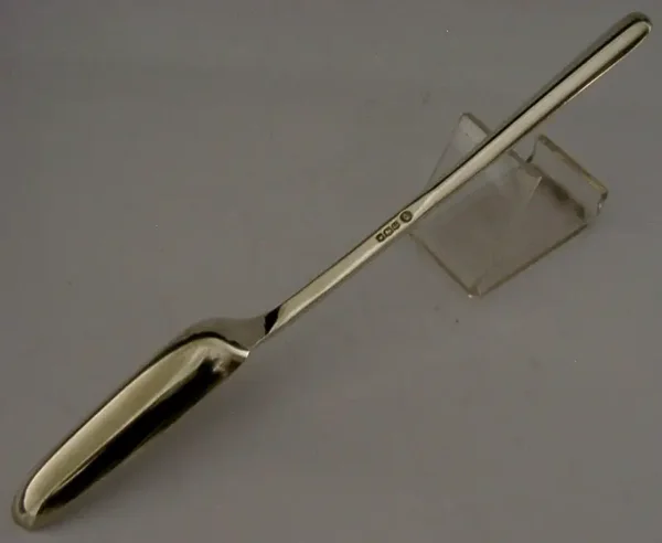 A English solid sterling silver marrow scoop (now more usually retailed as cocktail mixers). It is hallmarked for Sheffield 1966 with the maker being Francis Howard. It has been superbly designed and is in super condition having no dings splits distortions or repairs. It measures approx. 8.5 inches (21.8cm) long by over 0.75 (2.2cm) wide and weighs 46 grams. A quality piece.