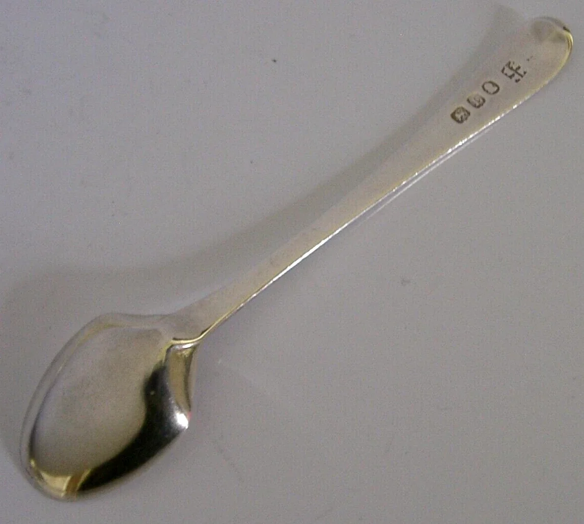 A rare antique English solid sterling silver egg spoon. It is hallmarked for London 1806 with the maker being William Eley I & William Fearn. It has been superbly made and has been engraved with a crest similar to that used by the Thackeray family. It is in superb condition being free from dings splits distortions and repairs. It measures approx. 4.75 inches (12cm) long by 1 inch (2.6cm) wide and weighs 14 grams. A very interesting example.