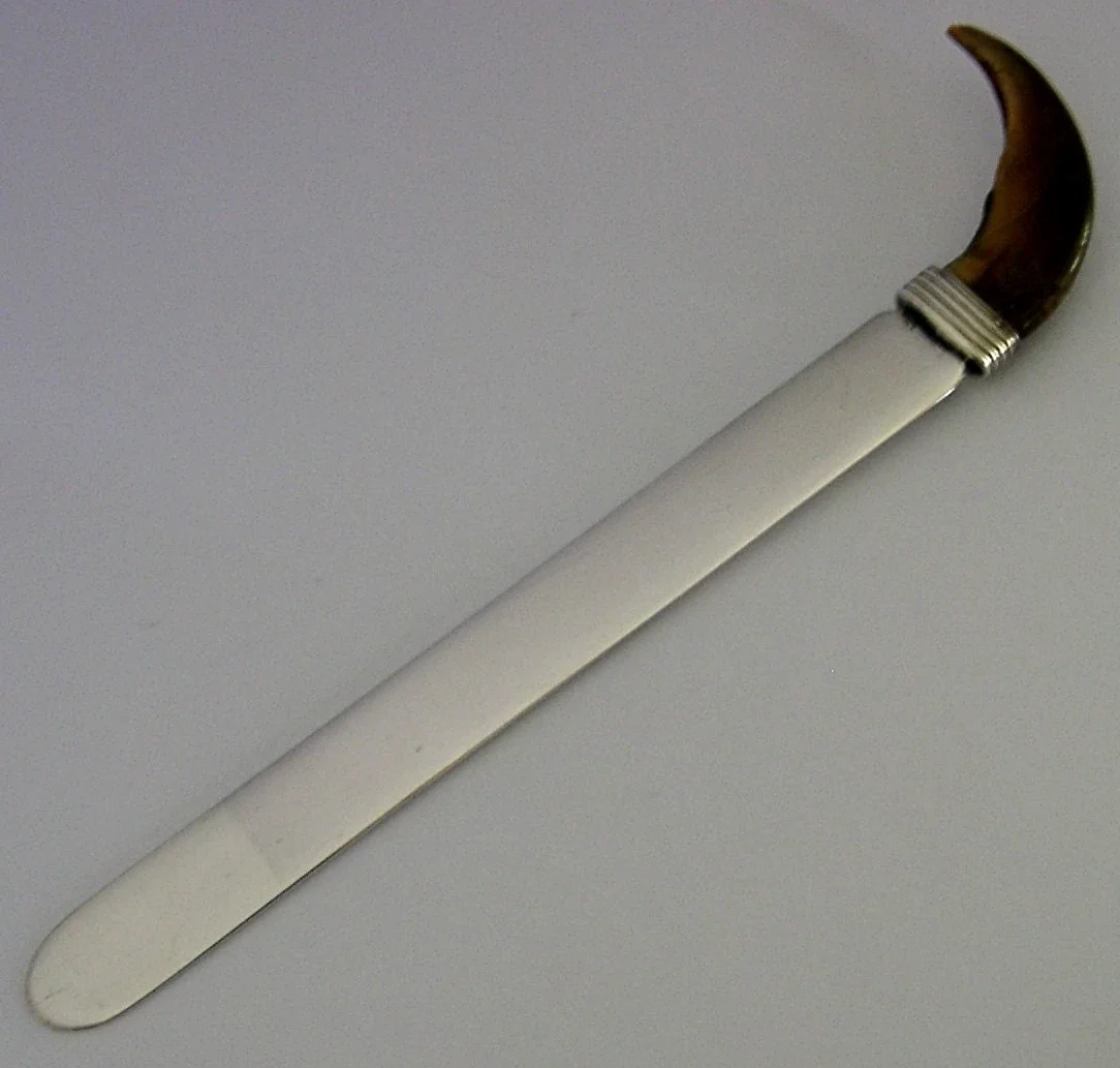 A very unusual Russian solid silver letter opener. It is hallmarked with a makers mark and the 84 silver standard mark. I would date it to c1910. It has been beautifully made having some form of horn handle and is in super condition being free from dings splits and repairs. It measures approx. 7.5 inches (19cm) long and weighs 34 grams. A very nicely designed example.