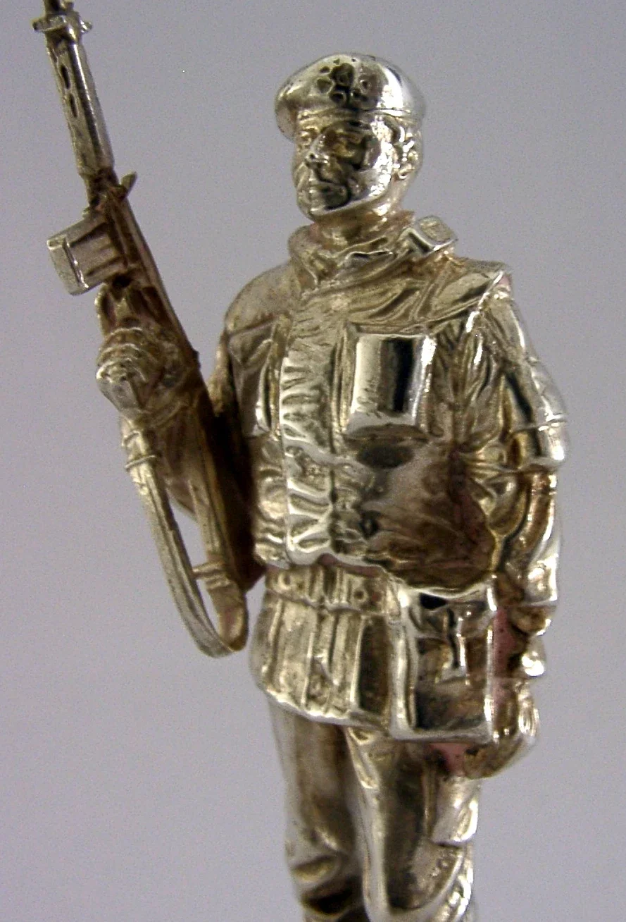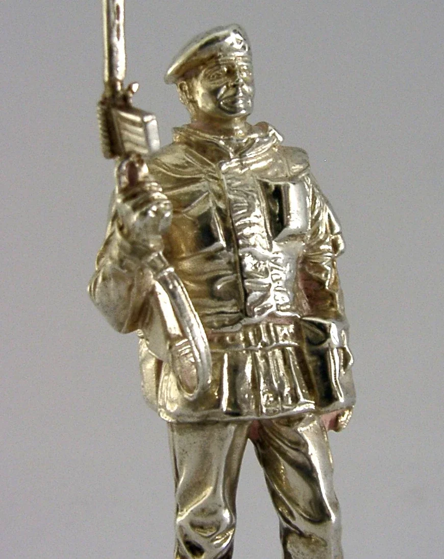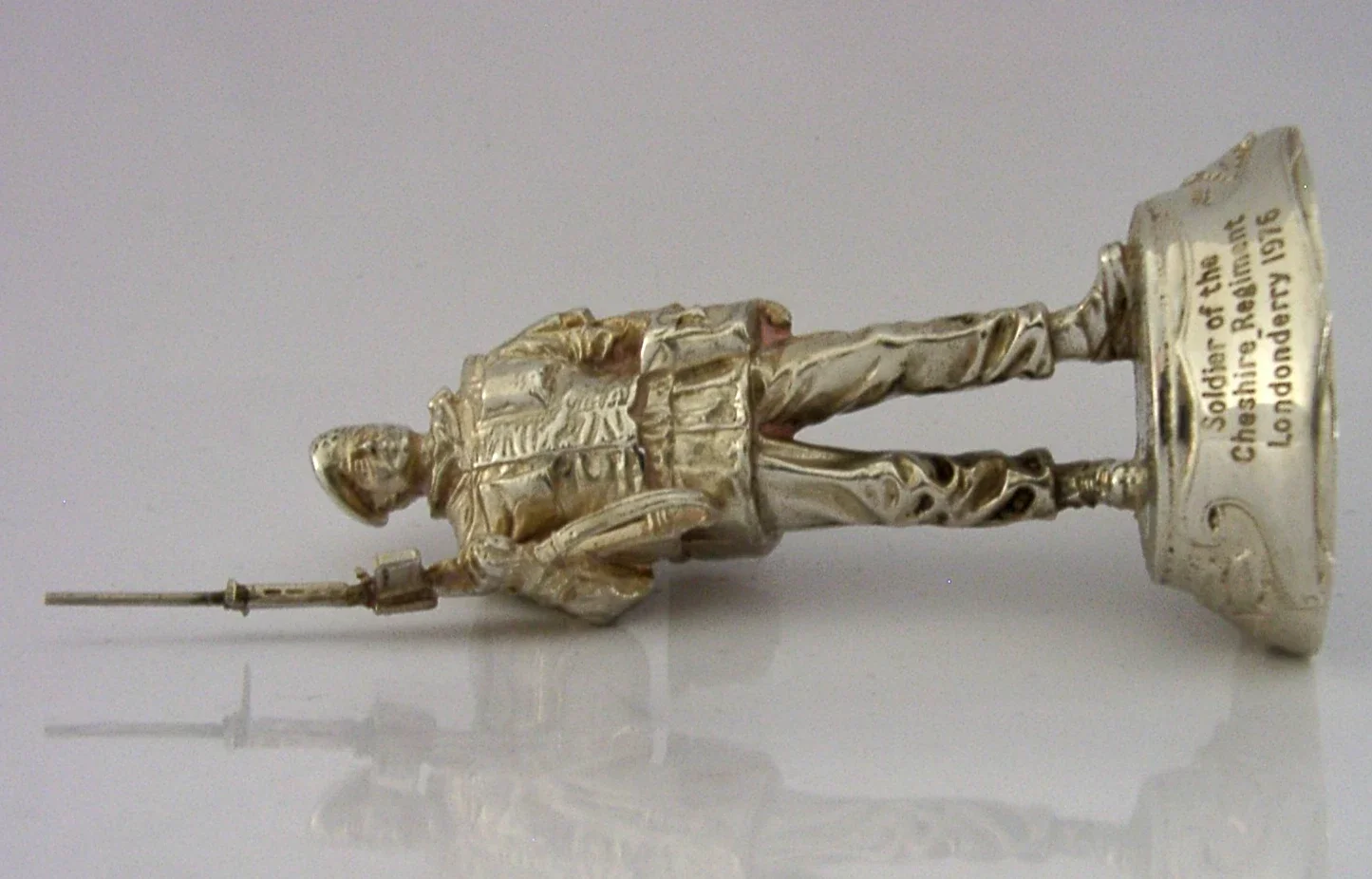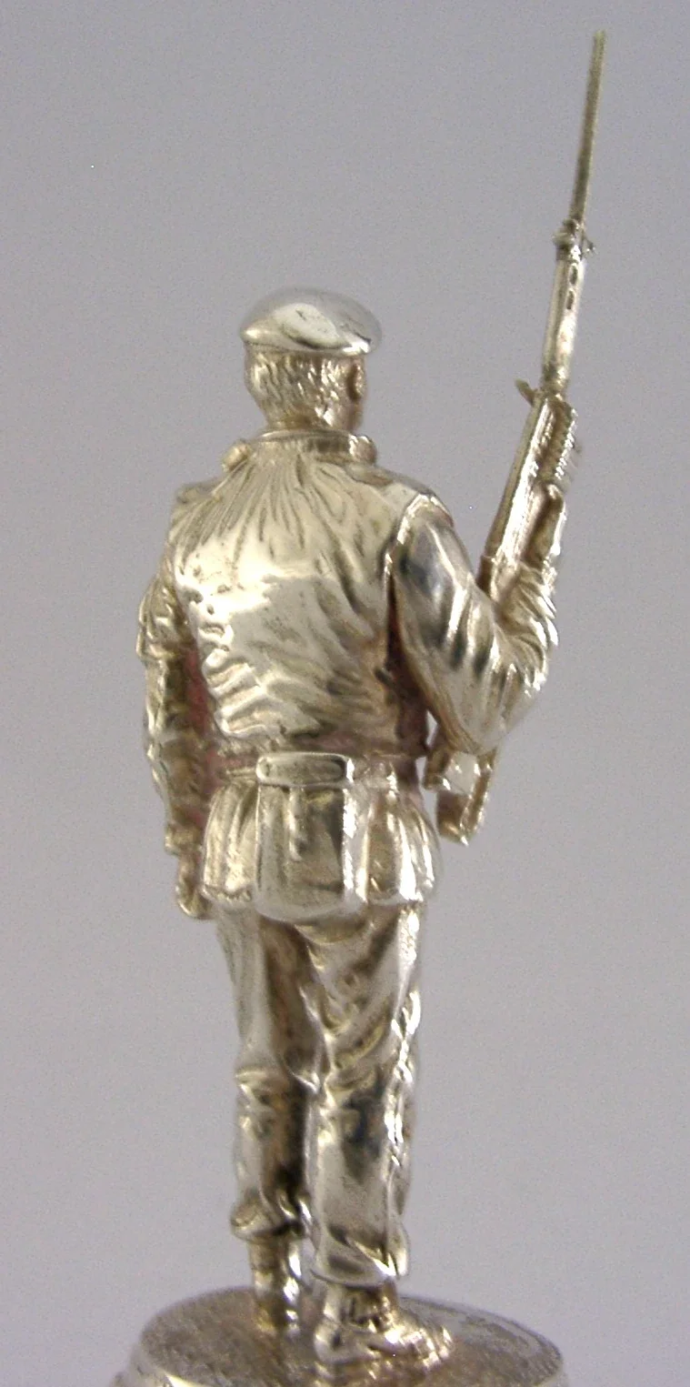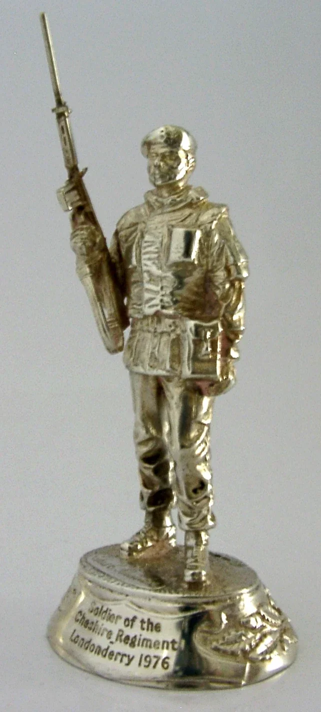 A superbly detailed very high quality cast solid sterling silver soldier figure. It is hallmarked for London 1976 with the makers marks being Charles (Chas) C Stadden - famous for military pieces. It has been superbly cast in the form of soldier of the Cheshire Regiment Londonderry 1976. It is in superb condition being free from dings splits and repairs. It measures approx. 4.5 inches (11.7cms) tall by 2 inches across the base and weighs 182 grams (total silver weight i.e. not filled or weighted). A very high quality unusual piece.