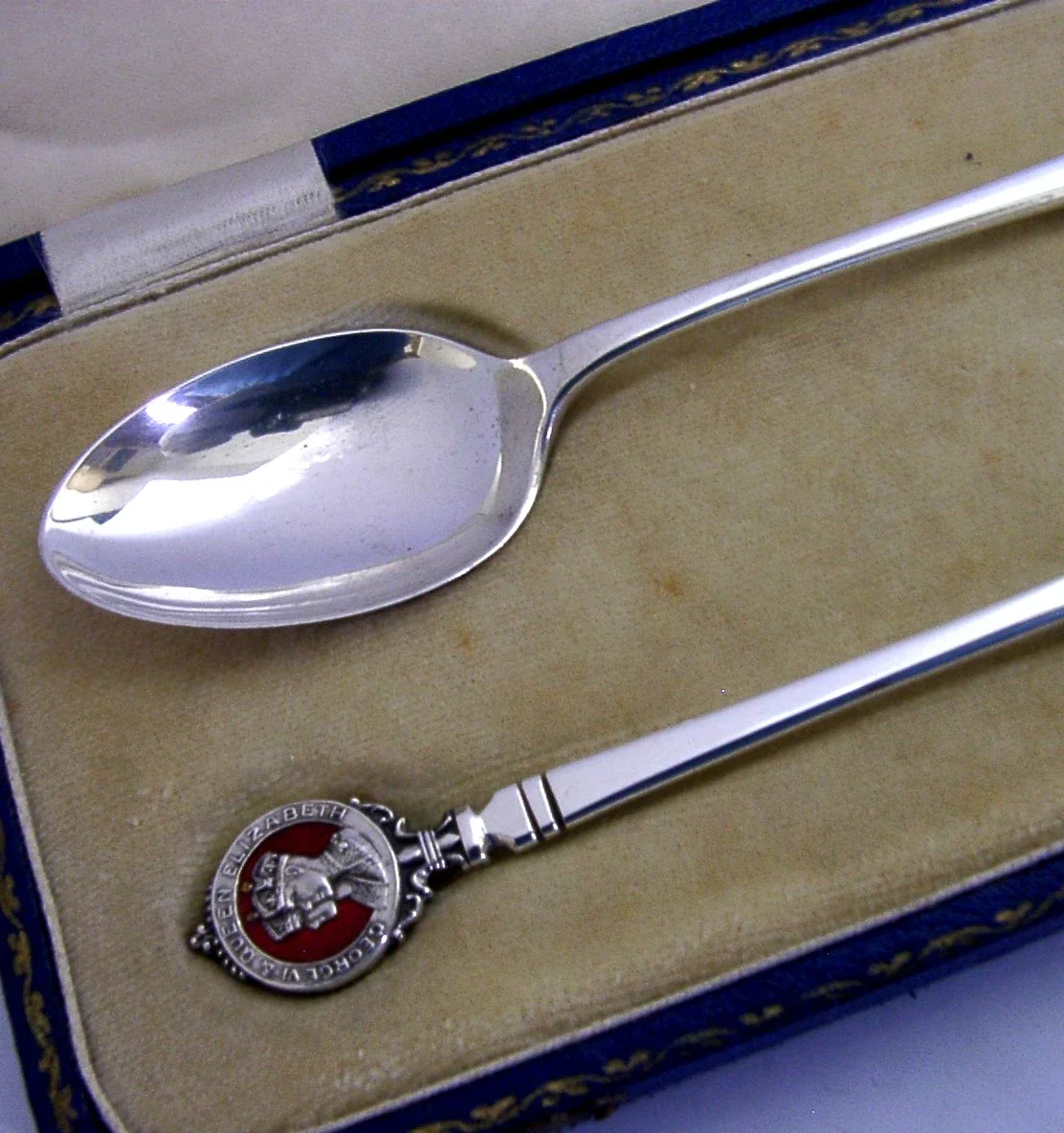 A super quality cased set of English solid sterling silver and enamelled spoon & fork. They are hallmarked for Birmingham 1936 with the maker being W H Haseler Ltd. They have been made as a souvenir of the coronation of King George VI. They are in superb condition being free from dings splits and repairs, the case is equally superb. They measure approx. 5 inches (12.8cm) long by 1 inch (2.6cm) wide and have a combined weight of 34 grams excluding the case. A very nice quality set.