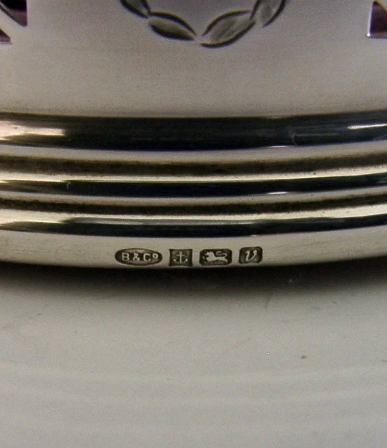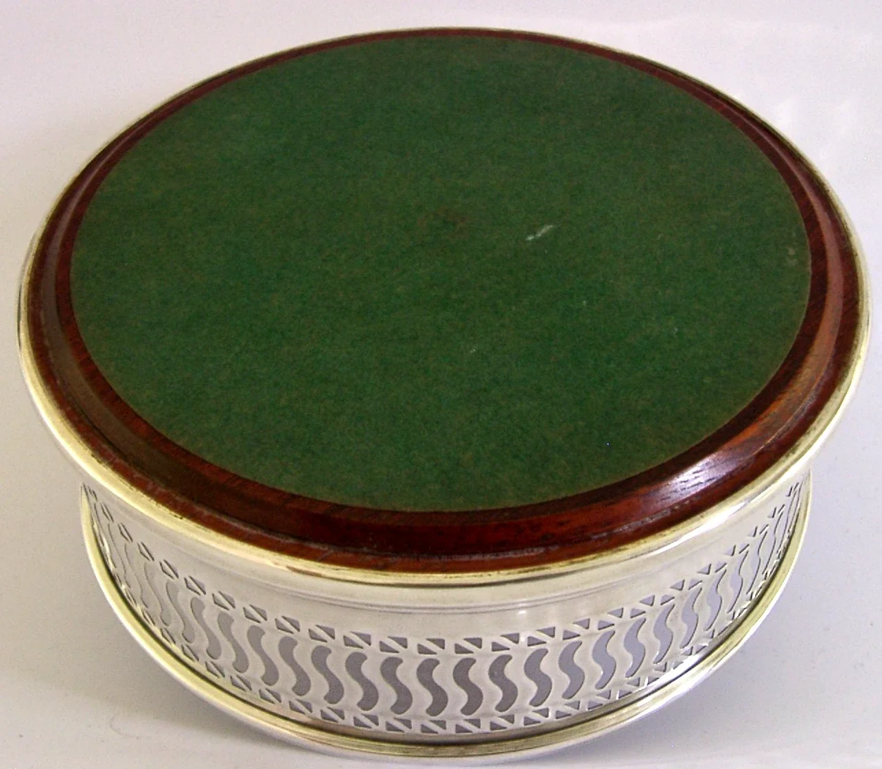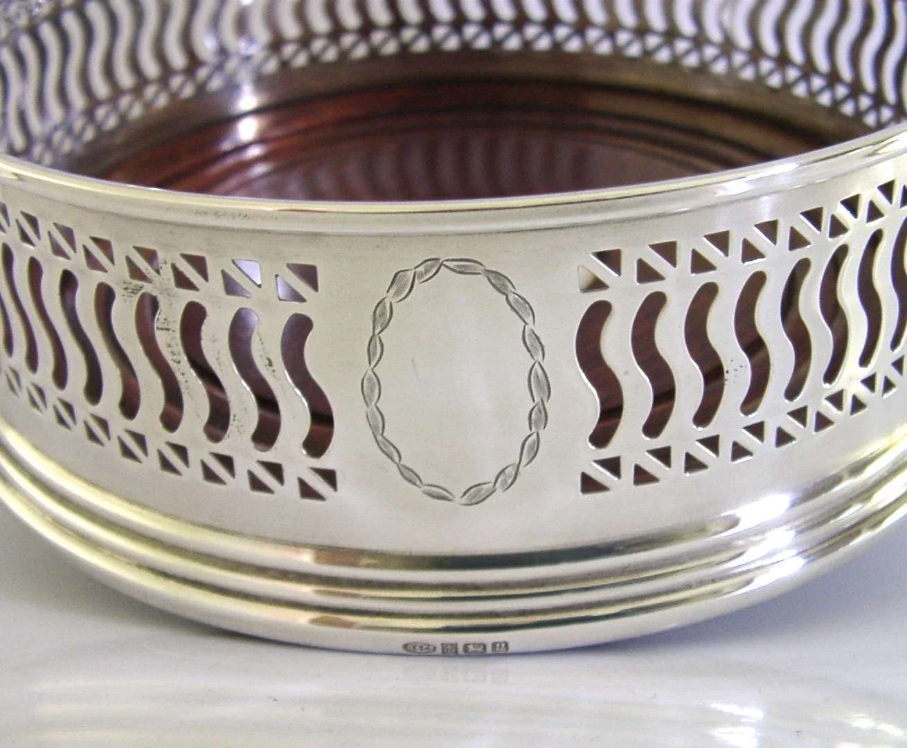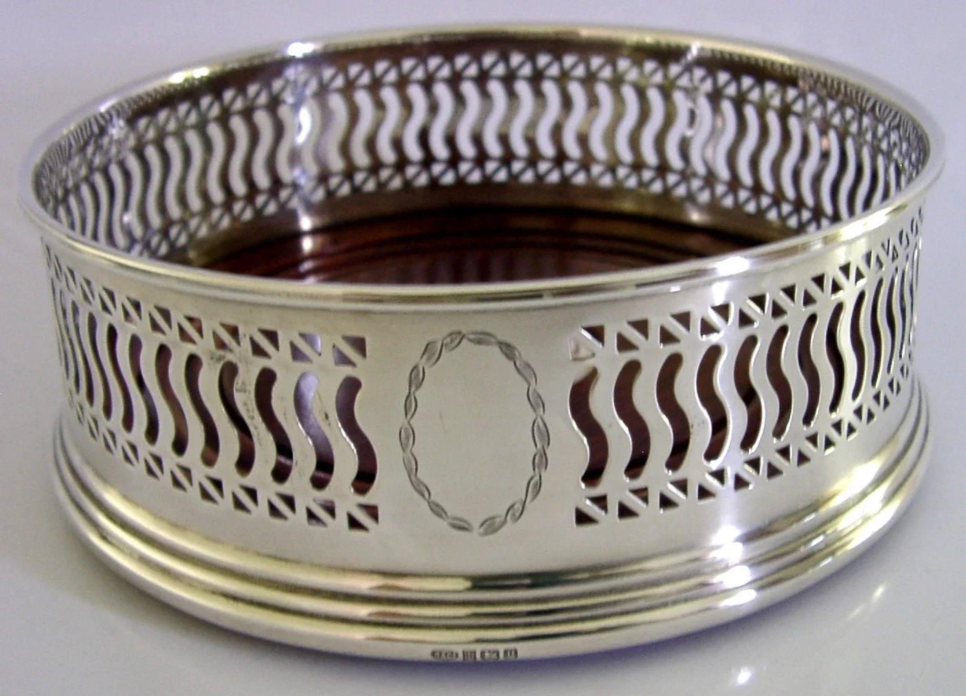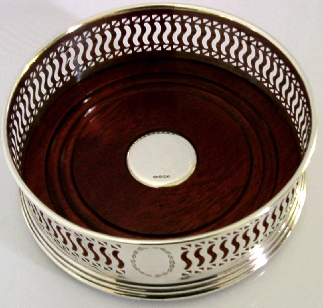 A super quality English solid sterling silver wine or campaign bottle coaster. It is hallmarked for Birmingham 1995 with the maker being B&Co. It has been superbly made with the sides being pierced. It is in super condition being free from dings splits and repairs. It measures approx. 5 inches (12.6cm) across by 2 inches tall and weighs 144 grams. A very nice quality piece.