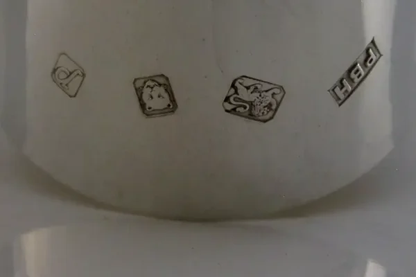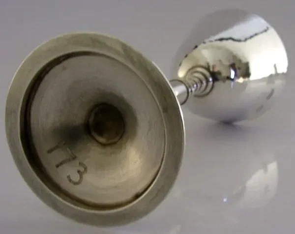A beautiful English solid sterling silver wine goblet. It is hallmarked for London 1971 with the makers marks being PBH for Peter Harwood of Cheltenham. It has been superbly designed being hand plannished. It was made for the Tewkesbury Festival of 1971 made in limited numbers, this being number 173. It is in superb condition being free from dings splits distortions and repairs. It measures approx. 6.5 inches (16.4cm) tall by 2.5 inches (6.1cms) across the rim and weighs 146 grams. A very good quality well made interesting piece.
