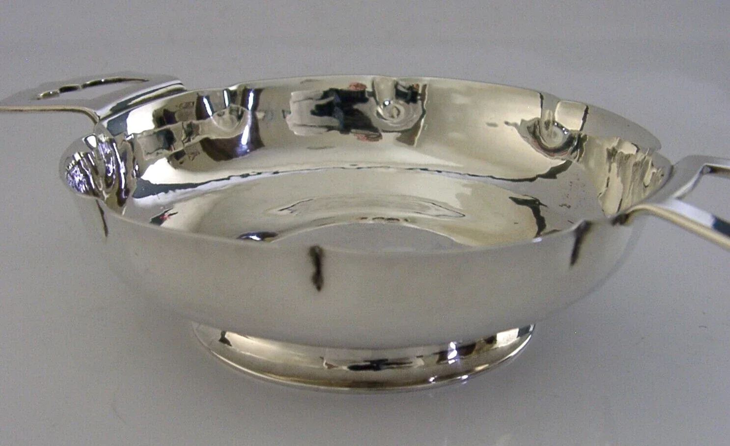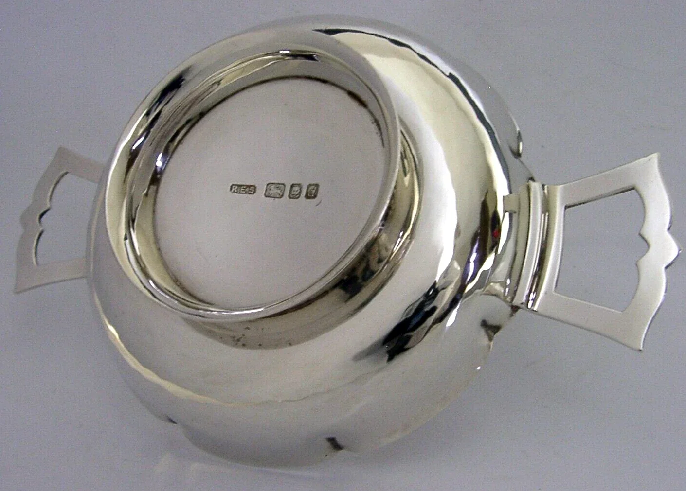 A beautiful heavy hand made English solid sterling silver quaich cup or two handled bowl. It is hallmarked for London 1959 with the makers marks being R E Stone. It has been superbly designed being planished and is in superb condition having no dings splits or repairs. It measures approx. 5.75 inches (14.5cms) across including the handles and 3.75 inches (9.5cms) excluding them by 1.25 inches (3.2cm) tall and weighs an impressive 109 grams. A stunning example.