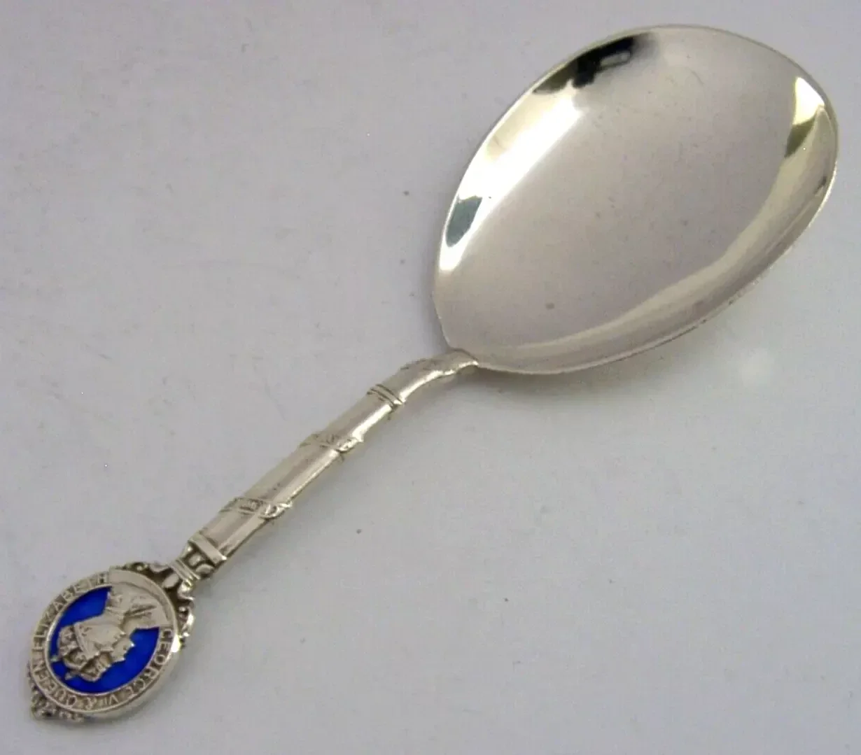An interesting solid sterling silver and enamel Royal souvenir caddy spoon. It is hallmarked for Birmingham 1936 with the maker being W H Haseler Ltd who made pieces for Liberty and Co around this time. It has been made as a souvenir of the coronation of King George VI. It is in superb condition being free from dings splits and repairs. It measures approx. 4.25 inches (10.6cm) long by 1.5 inches (4cm) wide and weighs 16 grams. A superb example.