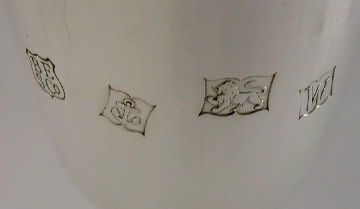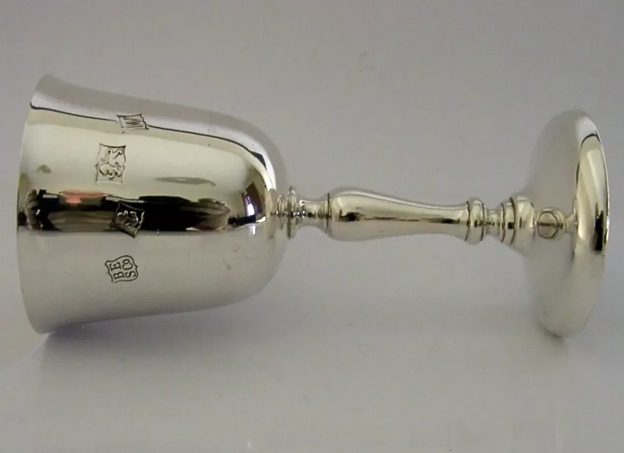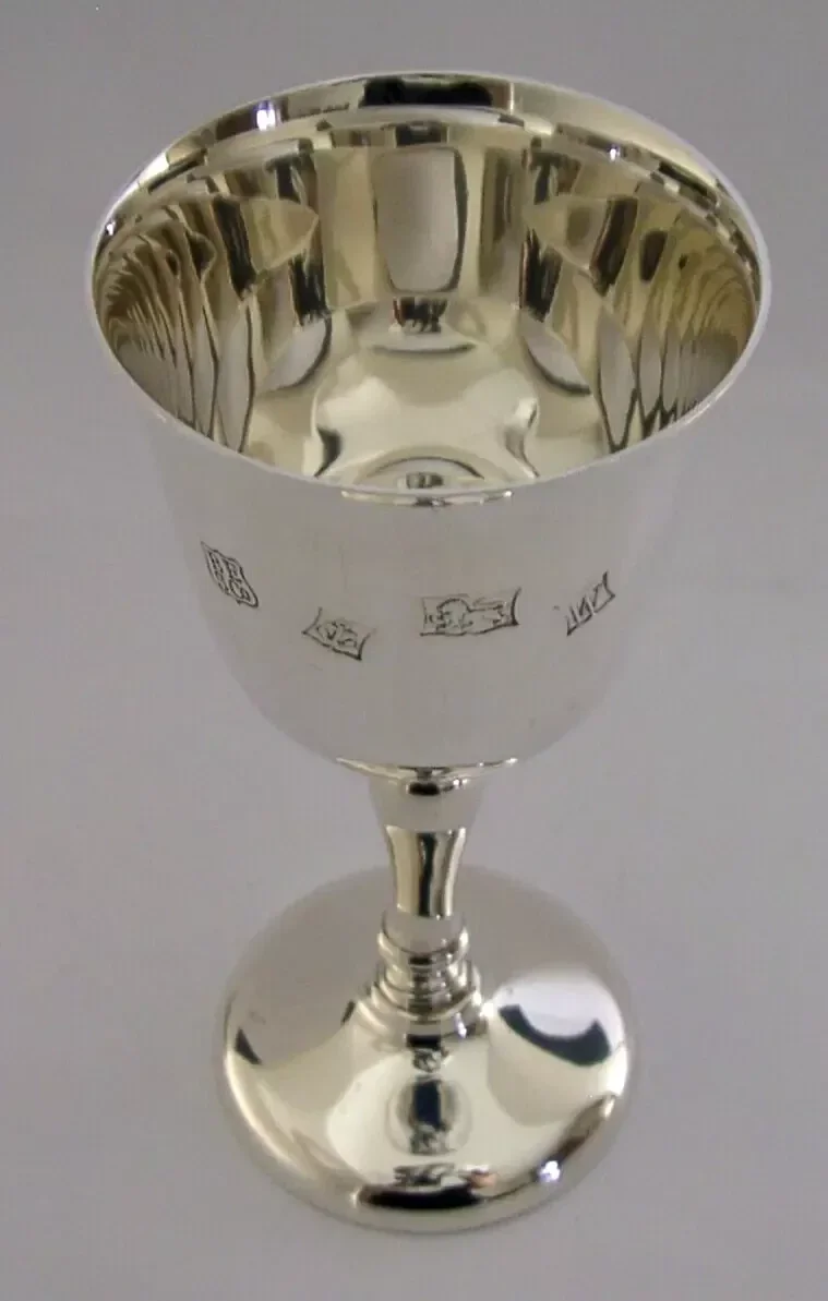 A very nicely made English solid sterling silver goblet. It is hallmarked for Birmingham 1971 with the makers mark being BESco. It has been superbly designed having feature hallmarks and is in superb condition being free from dings splits distortions and repairs. It measures approx. 5.5 inches (13.8cm) tall by 2.75 inches (7cm) across the rim and weighs 127 grams. A very good quality piece.