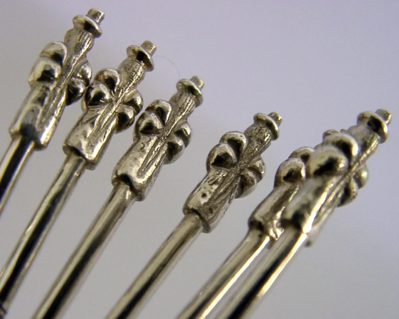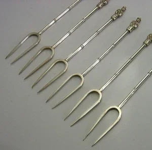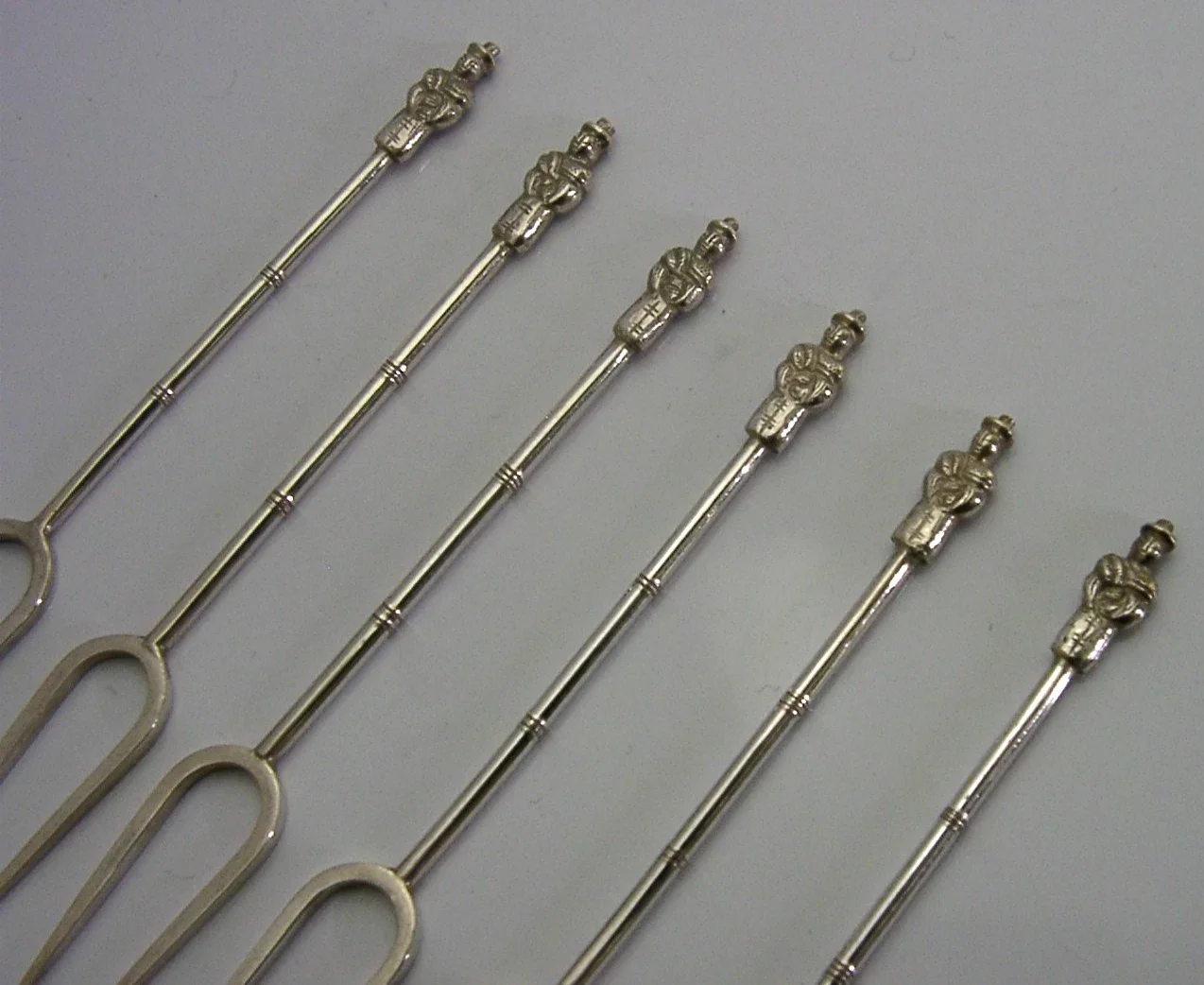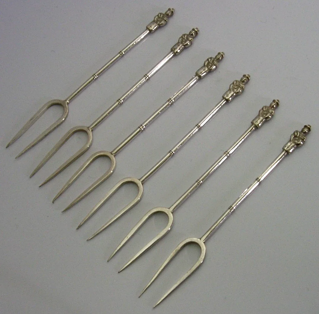 Six pretty Chinese export silver cocktail sticks / forks. They are unmarked but test as high grade silver. I would date them to c1920-1940. They have been nicely designed having Mandarins (scholars) to their terminals. They are in superb condition being free from dings splits distortions and repairs. It measures approx. 3.5 inches (8.3cms) long and combined weigh 20 grams. A superb set.