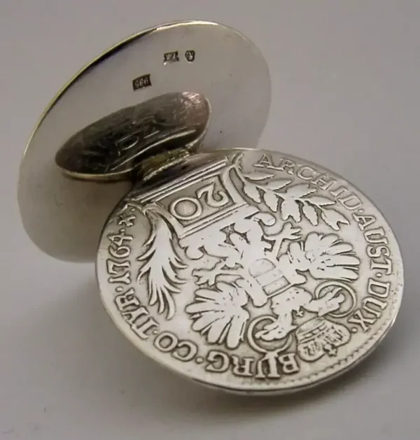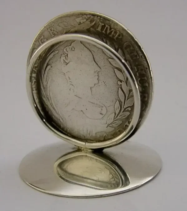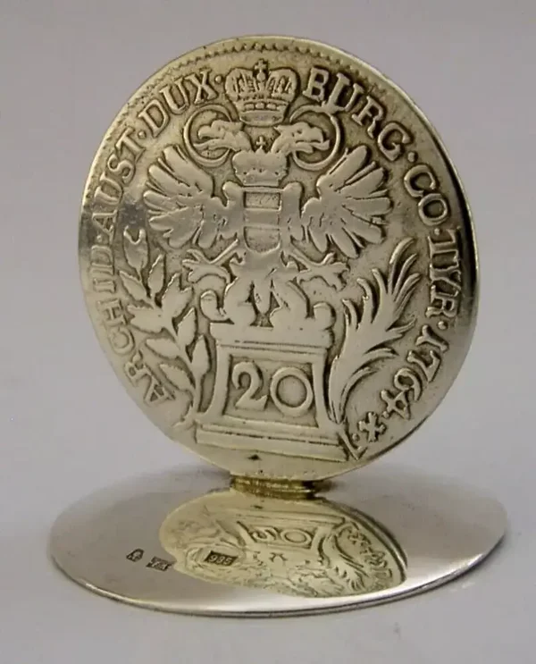 UNUSUAL AUSTRIAN SOLID SILVER 1764 COIN MENU HOLDER c1940 ANTIQUE