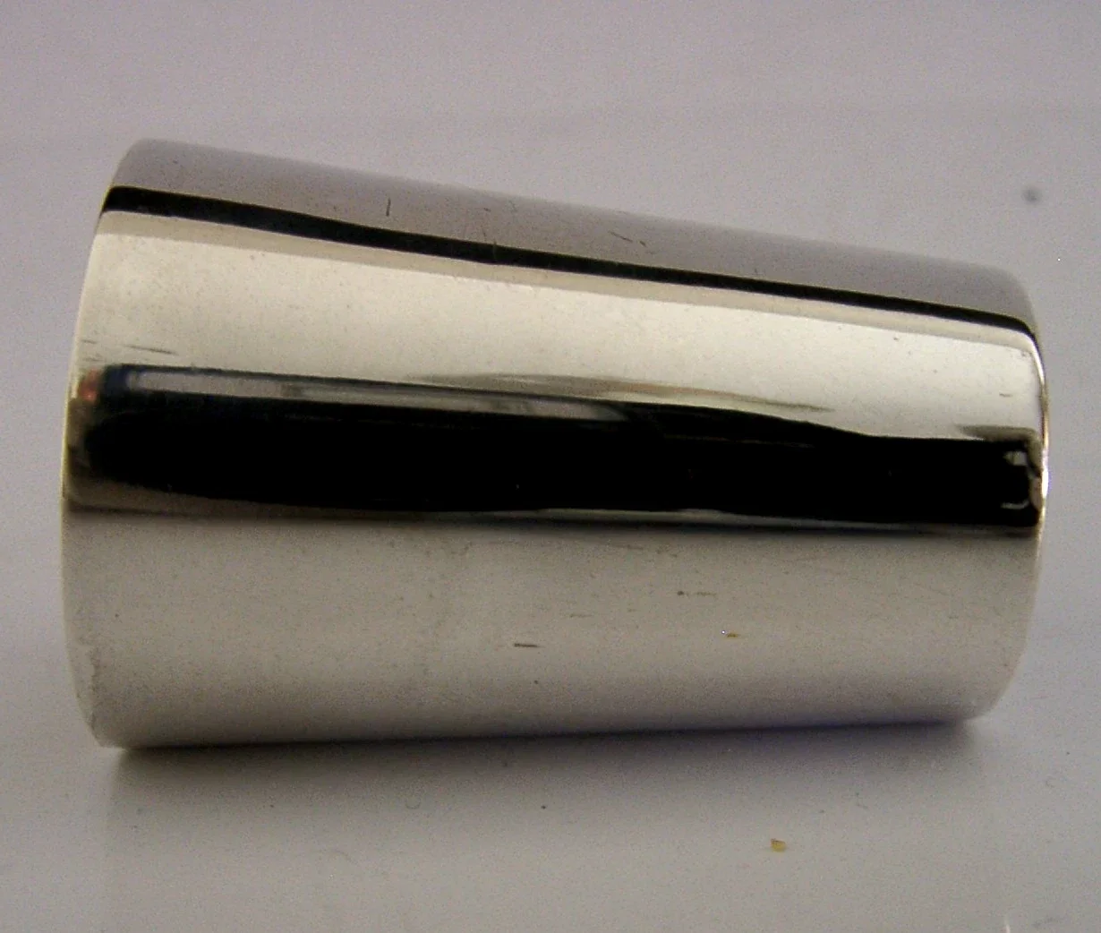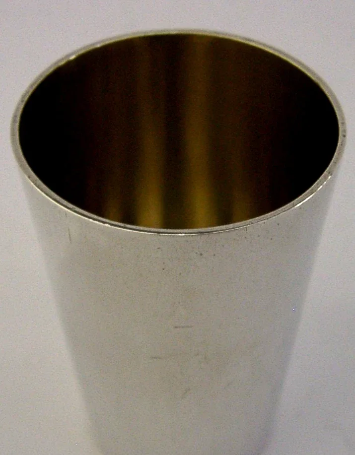 A nice quality German solid silver shot cup. It is hallmarked with the German crescent moon and crown mark along with the 835 standard mark and the makers mark of Bruckmann & Sohne who was active from 1805 to 1973. I would date it to c1920. It has been well made and is in superb condition being free from dings splits distortions and repairs. It measures approx. 1.75 inches (4.4cm) tall by over 1 inch (3.1cm) across the rim and weighs 16 grams. A nice quality piece.