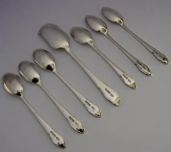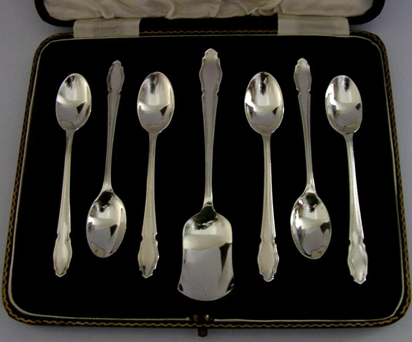 A lovely cased set of six sterling silver spoons and sugar scoop. They are hallmarked for Sheffield 1932 with the maker being C W Fletcher & Son Ltd (Charles William Fletcher). They have been made well made and are in super condition being free from dings splits distortions and repairs, the case also is superb. The spoons measure over 3.5 inches (9.2cm) long by over 0.5 inch (1.7cm) wide and the scoop 4.5 inches (11.6cm) long by over 0.7 inch (2.2cm) wide, they have a combined weight of 56 grams excluding the case. A nice quality set.
