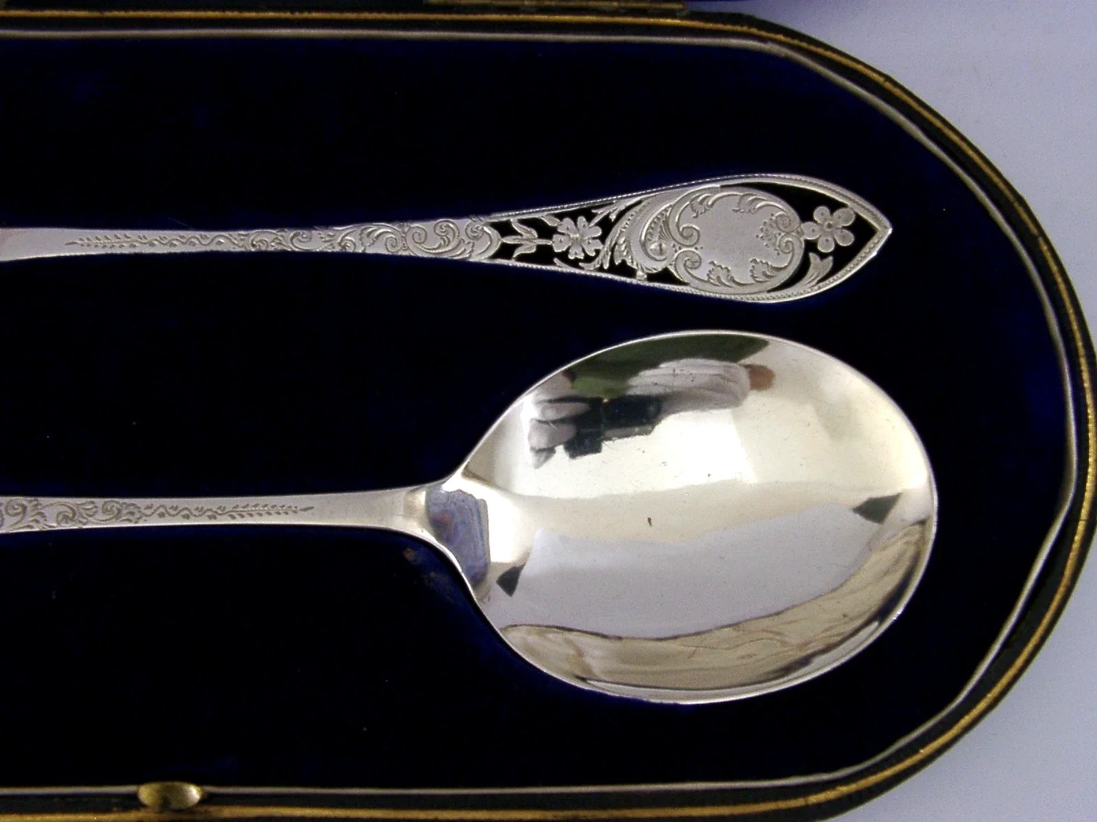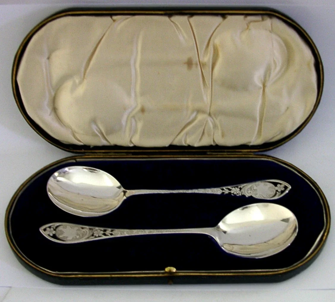 116g PAIR of ENGLISH ANTIQUE STERLING SILVER SERVING SPOONS 1911 CASED