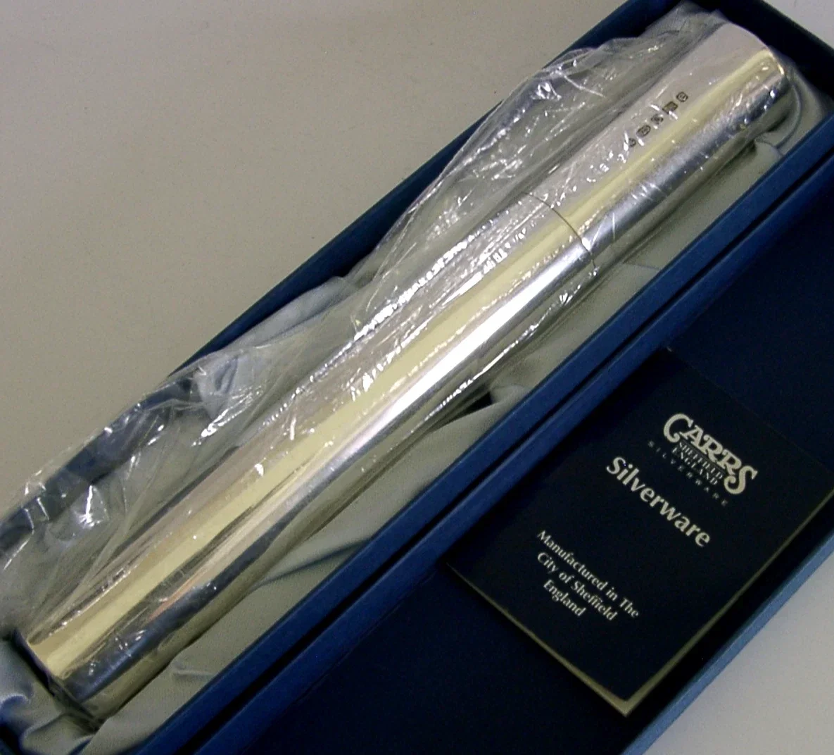 A mint boxed huge English solid sterling silver cigar tube or certificate holder. It is hallmarked for Sheffield 2004 with the makers marks being Carrs. It has a stylish design with feature hallmarks and is in superb condition being free from dings splits and repairs, still boxed and in its plastic cover. It measures approx. 8.75 inches (121.8cm) long by 1.25 inches (2.7cms) wide and weighs 140 grams. A top quality useable piece.