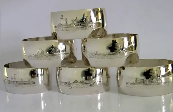 A nice set of six solid silver napkin rings. They are unmarked but test as high grade silver and date to c1920. They were made in Iraq most likely by the marsh Arabs. They have been beautifully made incorporated Arabic scenes. They are in super condition being free from dings splits distortions and repairs, three engraved WC and three MC (possibly acquired by a serviceman whilst stationed there in the interwar years - apparently the craftsmen would melt down cigarette cases, coins, and anything silver they could find to make and sell souvenirs to service personal and tourists). They measure on average 2.25 (5.7cm) by 1.75 inches by 1.25 inches tall and combined they weigh 112 grams. A very interesting set.